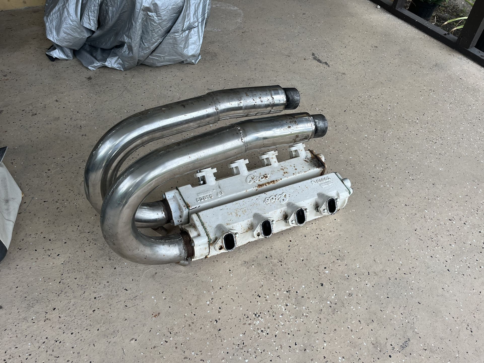 These exhaust manifolds are practically new and have only been in use for one hour. There was a project for a boat with a gasoline engine. We decided to install a diesel engine, an Hummer H1 and an outdrive mercruiser. Well, the project failed because the boat sailed very quietly. Now everything is for sale, including the engine and exhaust manifolds. These exhaust manifolds were custom purchased from Germany and cost $1500 each.