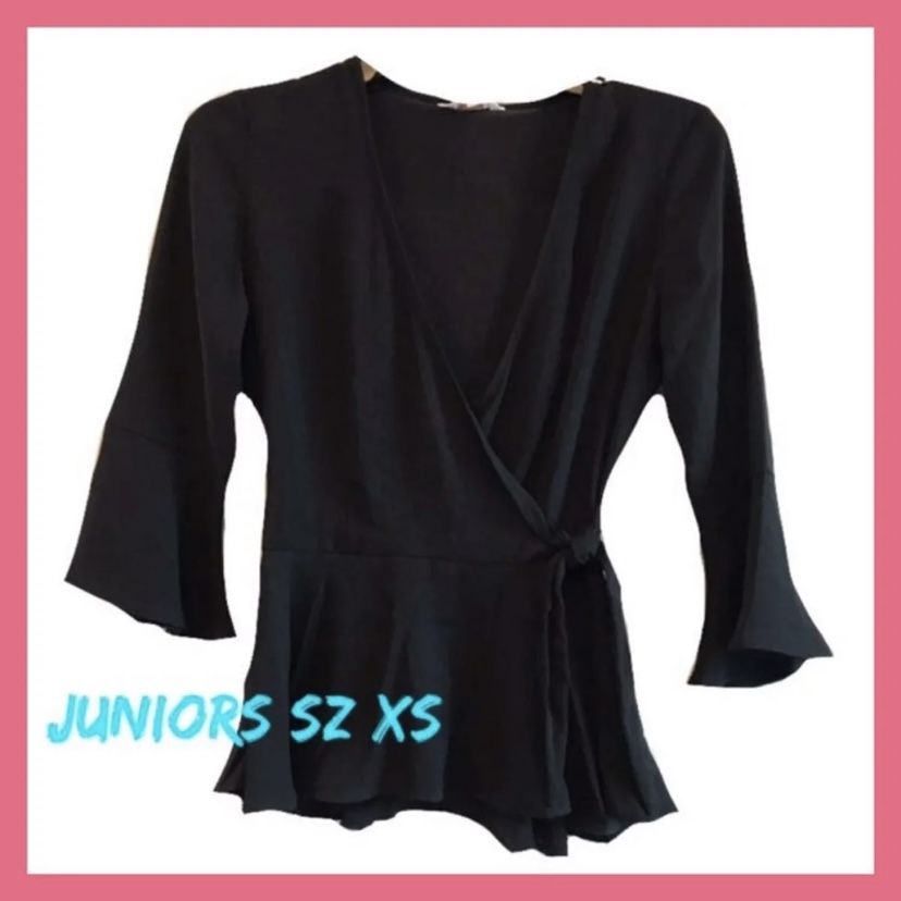 New juniors Candies black bell sleeve wrap top size Sz: XS. info in last photo. 100% Polyester. New w Tag Retail: $38. Item Weight:5oz.