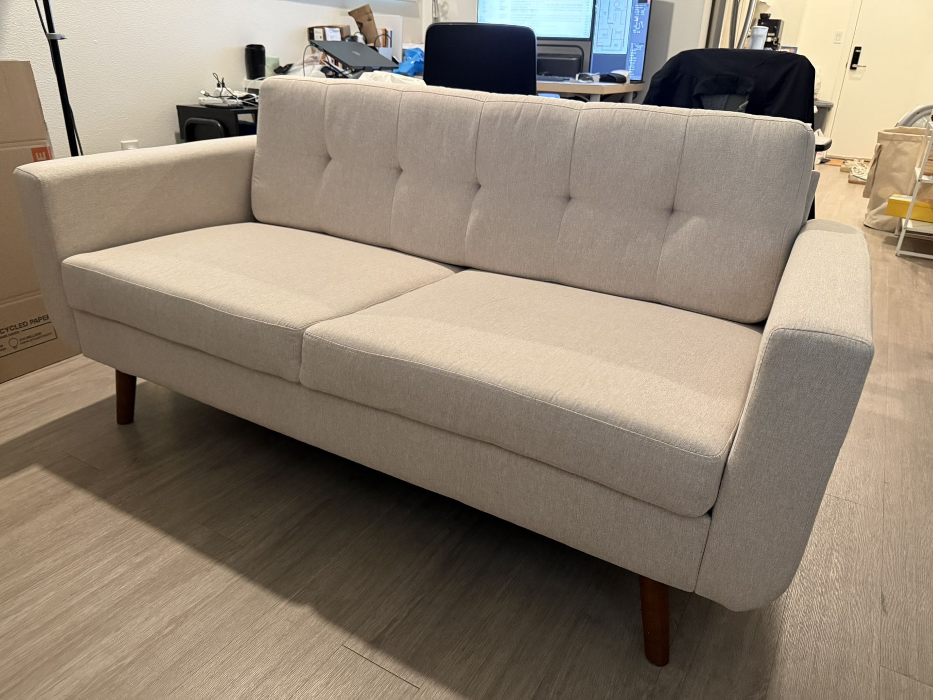 Beige colored couch. About 65 inch in length. Great condition. Owned for 2 years as a single owner, no pet or smoke. Pick up only