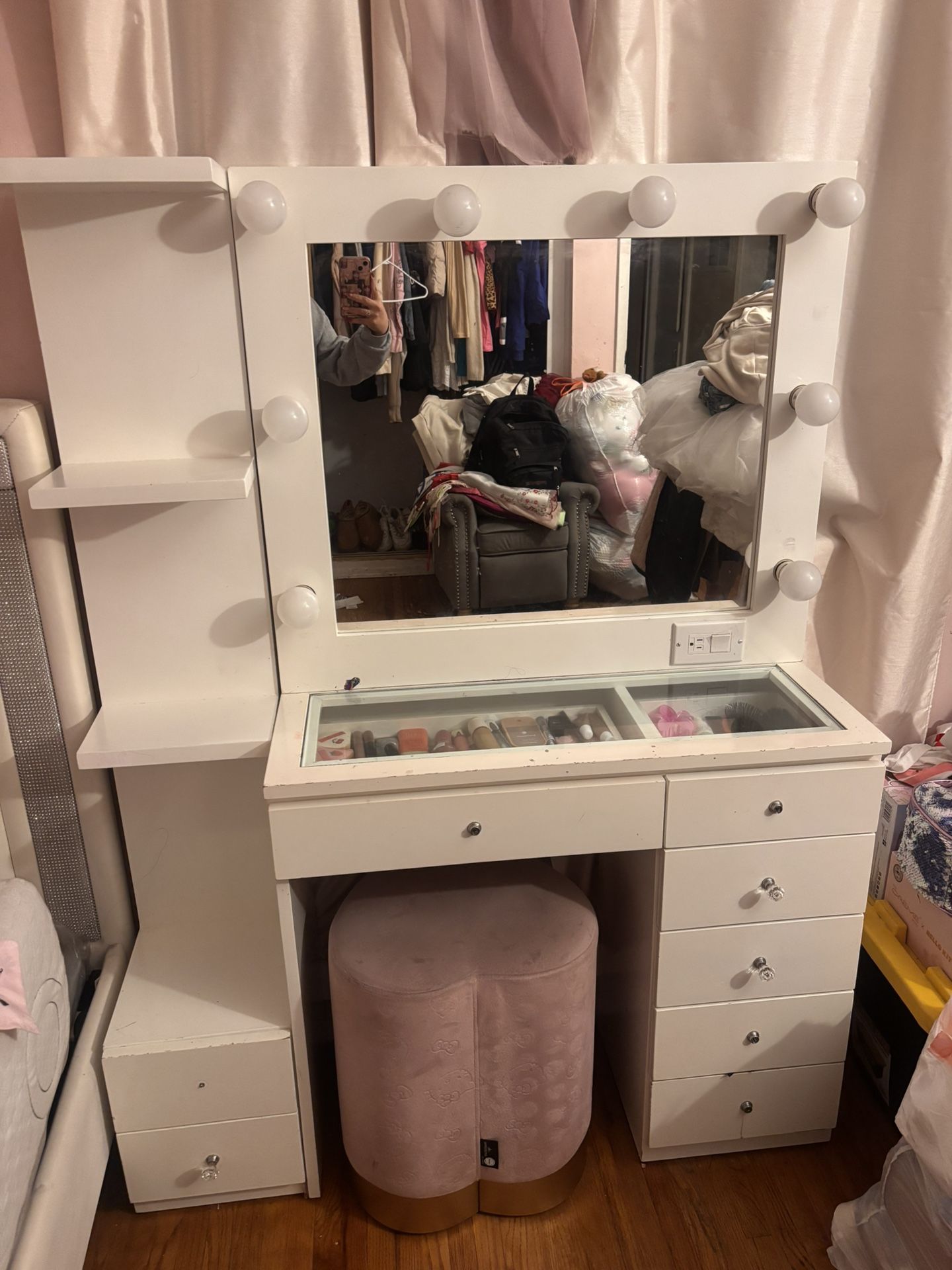 Girls vanity comes with the shelve, mirror with lights and drawers. Not the pink stool. $100 it just needs new knobs and a little TLC