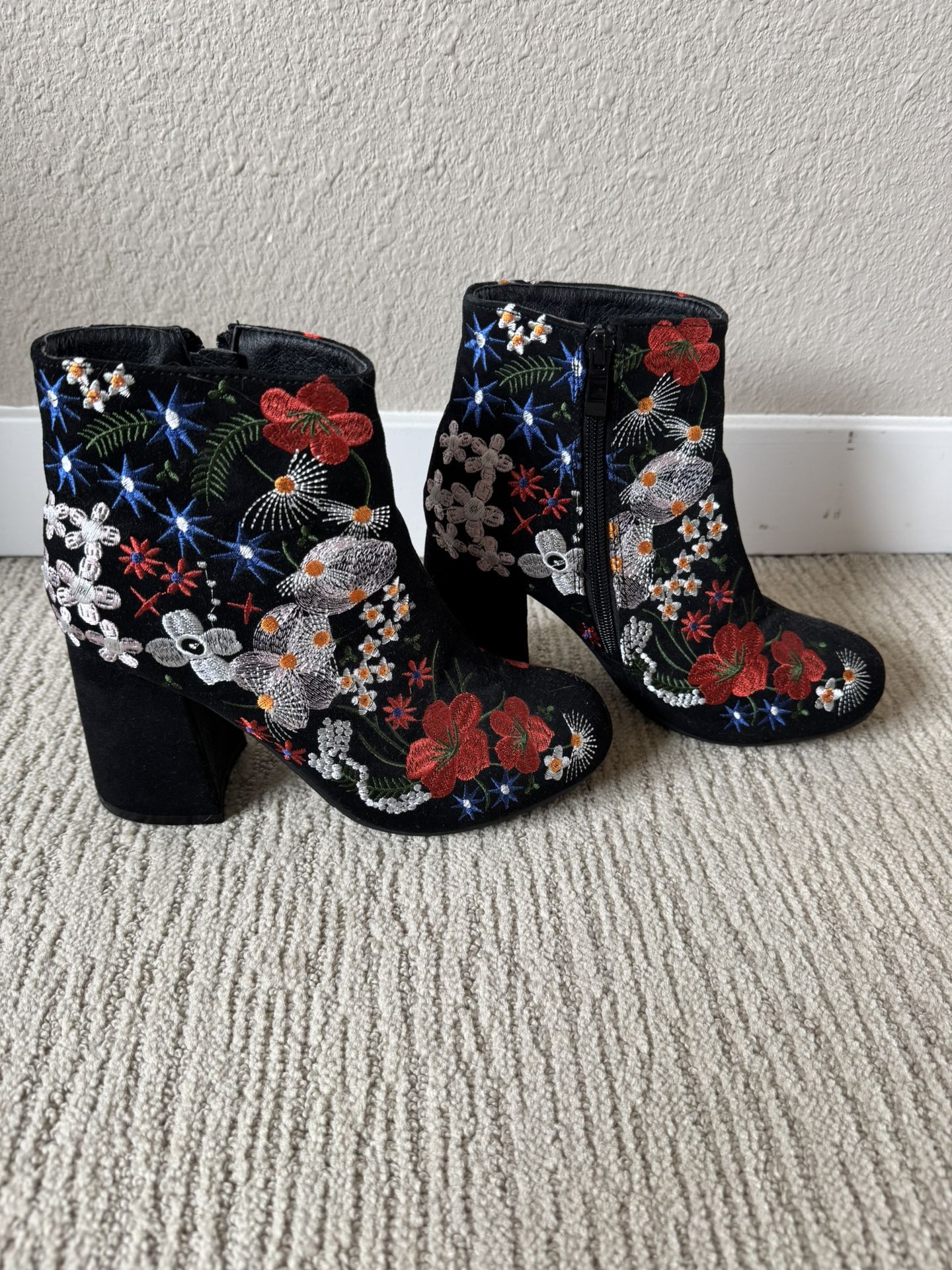 Qupido brand embroidered booties with red white yellow blue green design. No size tag, fits women size 7.5-8. Heel height 3.5 inches. Used, excellent condition.