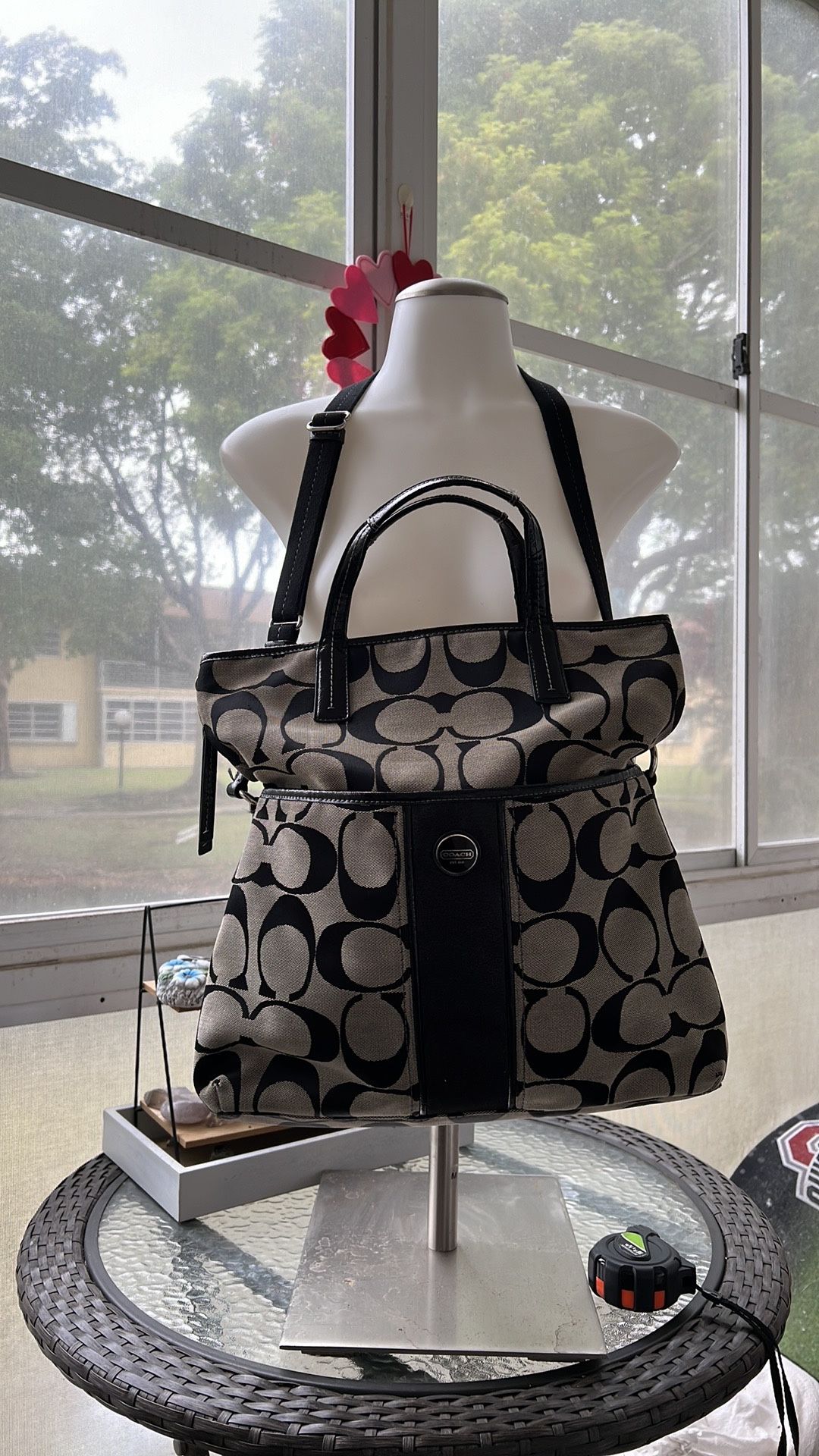 This is a really big Coach bag Canvas and leather with signature kissing Cs Measures 14” x 14” and can be worn as shoulder or crossbody bag as it comes with adjustable crossbody strap as well Tiny bit of rub wear to one corner but no holes rips or tears