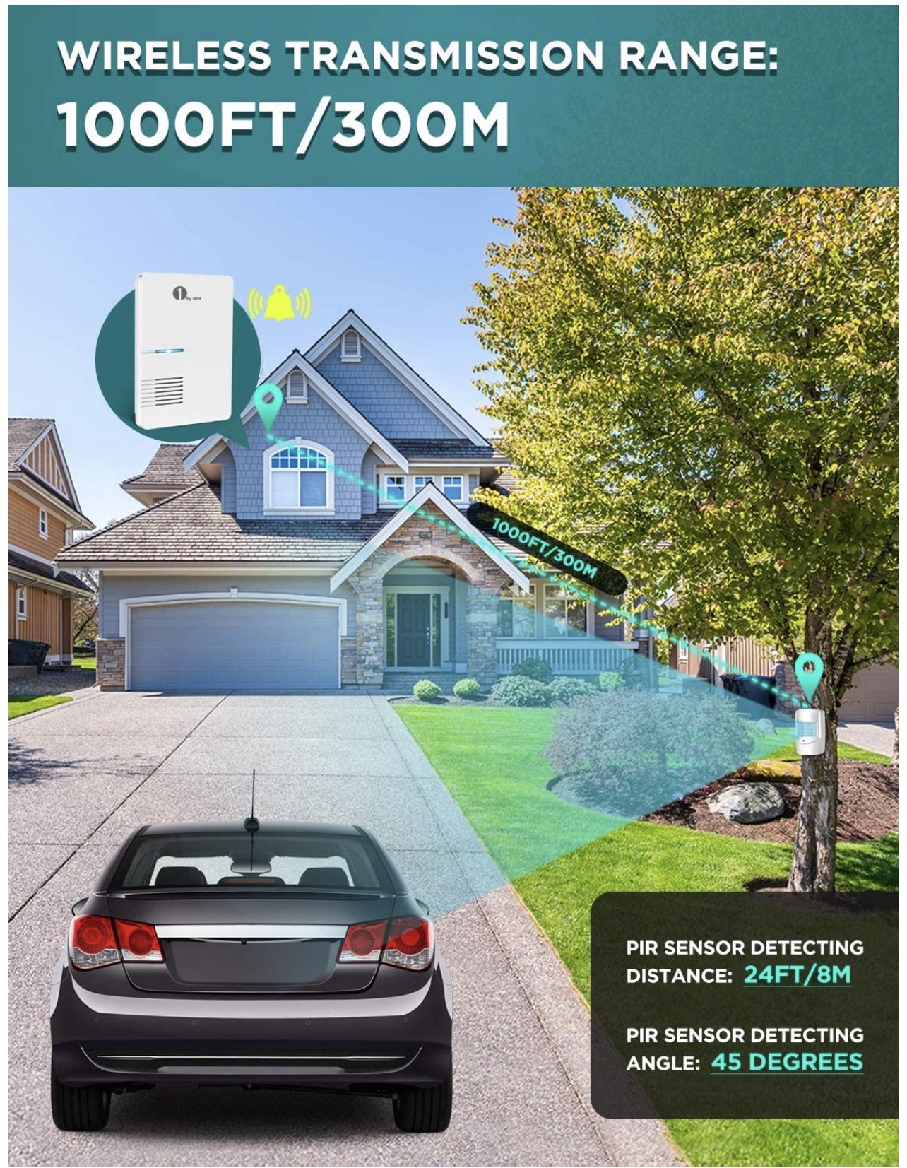 Driveway Motion Intruder Alarm Sensor Operating, 36 Melodies, Home Security Alert System with 1 Plug-in Receiver 2 Weatherproof PIR Sensors