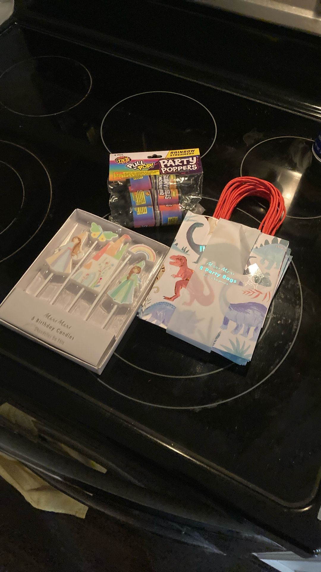 Party rainbow streamers, party bags, 5 birthday candles
