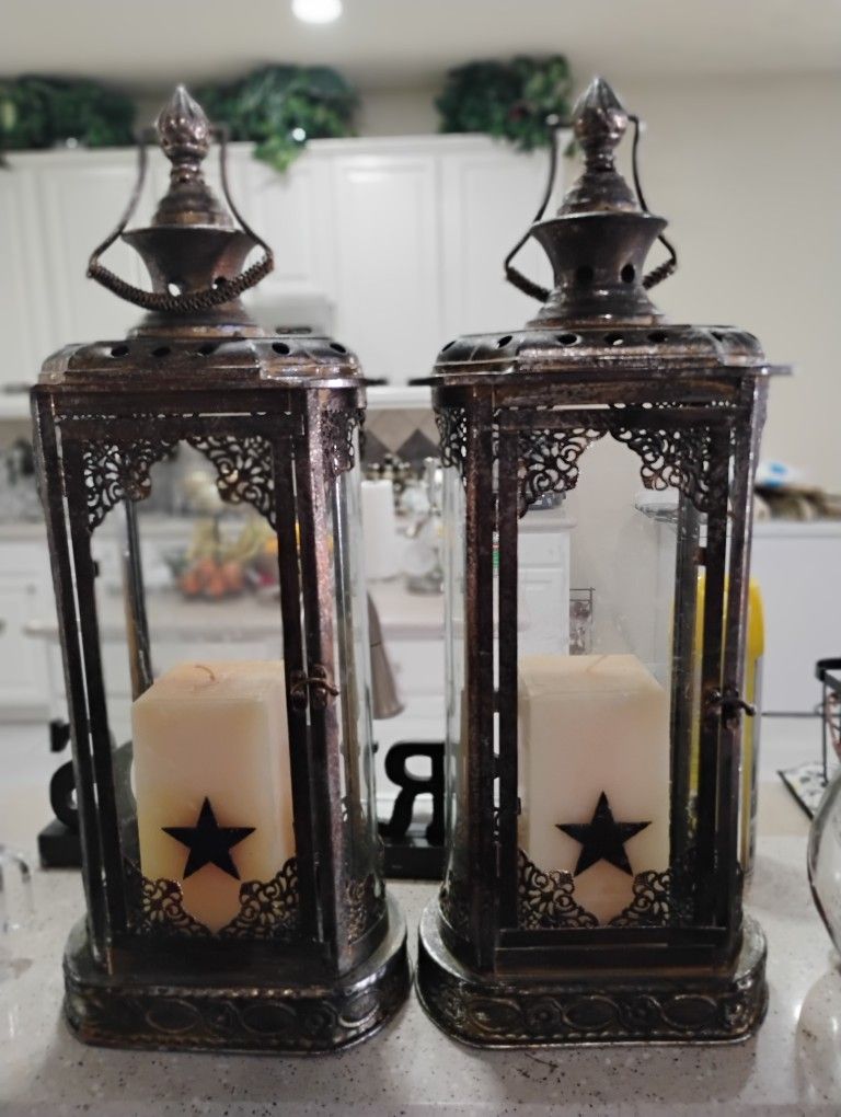 As the title describes these are some beautiful rustic antique lanterns that I've had for some years now. Over the years I've collected many antiques and this set is very unique. Custom candles fit perfectly with the metal crusted star wedged in the wax. These lanterns can be hung and or displayed on a bar, fire place, etc ... Asking price $80