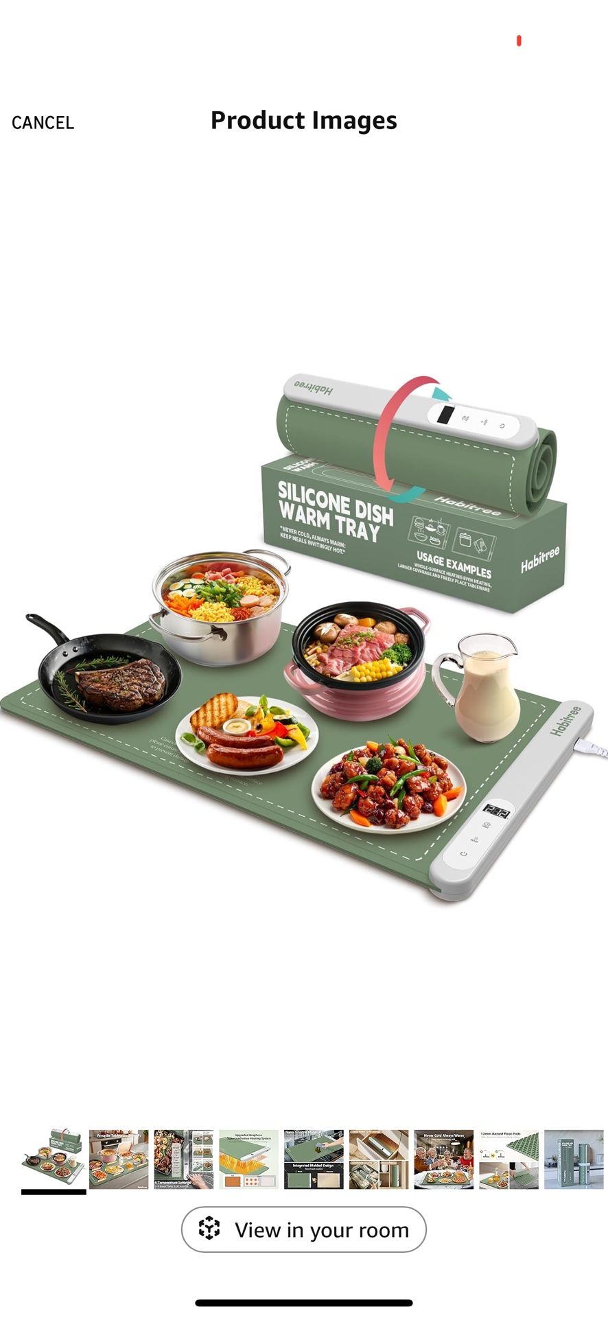 β οΈπ£ππππ¦π ππ’ π‘π’π§ π¨π¦π ππ§ π’π‘ π ππππ¦π¦ ππ’π¨π‘π§ππ₯π§π’π£!!! Due to physical characteristics, using food warming mats for countertop in cold weather will lead the countertop to expand, shrink or break, thus leading to danger ππππ-ππππππππ‘ππ¬ π₯ππ£ππ ππππ§ππ‘π Graphene superconductor system ensures fast, even heating across the entire surface, outperforming traditional heating systems and reducing preheating time. The dimensional size of Habitree heating pad for food is 23.6x14.6inches with a heating area of 20.5x12.8inches π¨π£ππ₯ππππ π² π§ππ π & π§ππ π£ππ₯ππ§π¨π₯π ππ’π‘π§π₯π’π Habitree heating mat for food equips with 6-level temperature settings and 6 preset timer modes, providing more accurate temperature control than the normai 3-mode-one. Automatic shutdown after 6 hours ensures both safety and efficiency π¦π£πππ-π¦ππ©ππ‘π π₯π’ππ-π¨π£ π¦π§π’π₯πππ Saves more space than common heating containers on the market, more portable and suitable for home, office, travel, party, camping, etc. Detach the cord and roll the mat up when not in use to save more space for a neat kitchen π§ππππππ‘ππ π‘π’π‘-π¦πππ£ ππππ§ ππ’π₯ πππ§π§ππ₯ π§ππππ π£π₯π’π§πππ§ππ’π‘ The silicone warming mat for food is equipped with thicker and higher small feet evenly spaced. These feet provide anti-slip benefits, facilitate heat circulation, aiming to prolong the lifespan of food heating mat, and prevent burns on the table surface π£π₯ππ ππ¨π π ππ§ππ₯πππ & πππ¦π¬ πππππ‘ππ‘π Thickened warming mat for food is made of premium Nano silicone material for better thermal conductivity. The integrated design of food warmer mat is oil and stain-resistant, ensuring easy cleanup and longevity Heat Settings 50Β°C(122Β°F) / 60Β°C(140Β°F) / 70Β°C(158Β°F) / 80Β°C(176Β°F)/ / 90Β°C(194Β°F) / 100Β°C(212Β°F) Timing Function Customizable heating pad operation time, can be set to automatically shut off after 1-6 hours Power Output 500W Input 100-120V Product Dimensions 23.6*14.6inch in Expand tile size Product Weight 3.6 Pounds Heating Area Dimensions 20.5x12.8 inches Main Function Perfect for warming and defrosting dishes. Not recommended for boiling water, cooking, or other food preparation Anti-slip Plaid silicone anti-slip texture on the bottom Heating Element Patented graphene heating technology provides wide coverage and uniform heating Support Containers Stainless Steel/ Milk Bottle/ Glass/ Tin Foil Tray/ Frying Pan/ Ceramics/ Enamel-Coated Pot and etc
