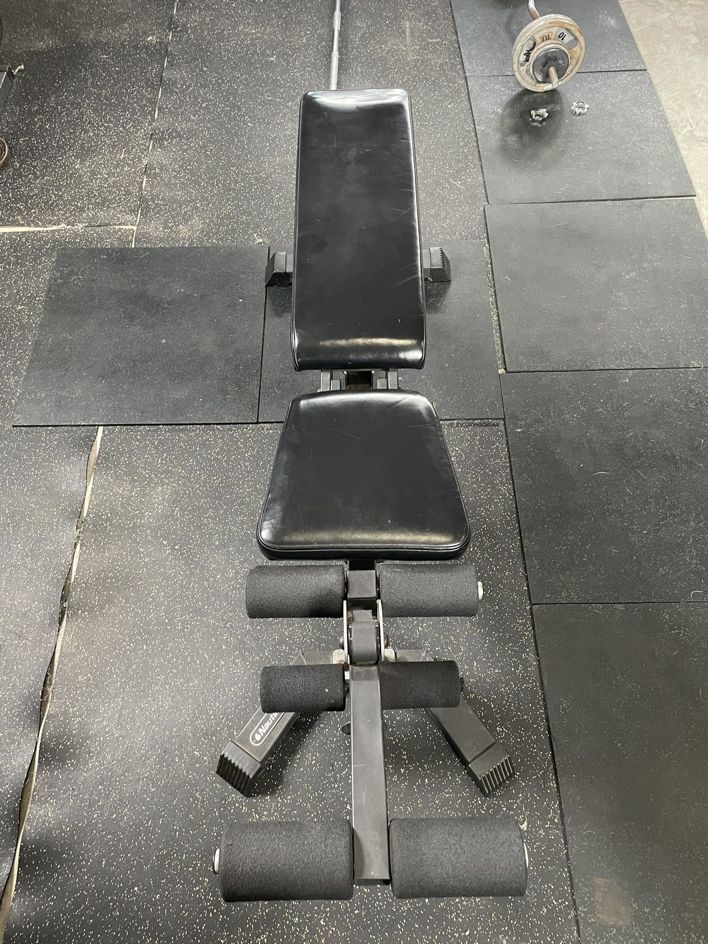 Adjustable bench with leg raise and hamstring curl attachment.
