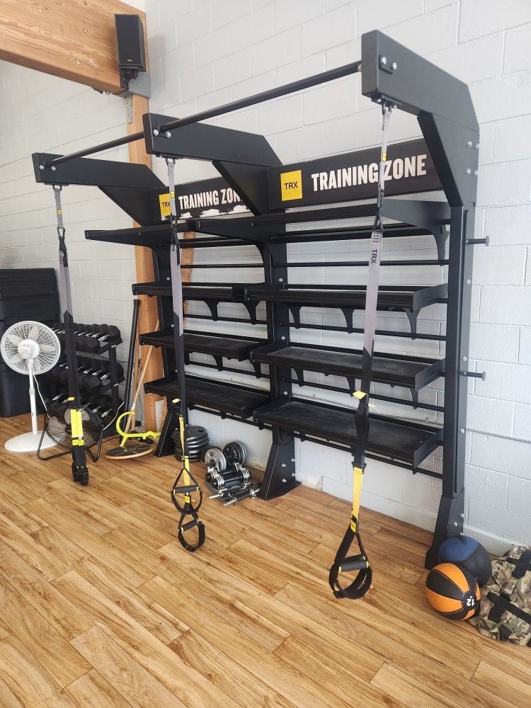 TRX Studio Line Suspension Bays provide the ideal, all-in-one storage rack and training station. Available in four configurations to maximize floor space and intuitively integrate into both personal and group training sessions. TRX Studio Line Suspension Bays are a durable and compact multi-purpose solution for storing medicine balls, dumbbells, kettlebells, tubing, and accessories - all while offering a space for suspension training exercises, battle rope stations, and more! Health clubs, schools, and commercial gyms love the design of the TRX Studio Line because every configuration displays training tools neatly with easy access for members, prioritizes limited floor space, and increases the overall functionality training spaces of all sizes.This highly customizable suspension anchoring and storage systems maximize space efficiency and exercise functionality, while emphasizing design and aesthetics to suit the needs of each unique member, space, and activity. Double Bay: 103" W x 7'10" H x 40.5" D