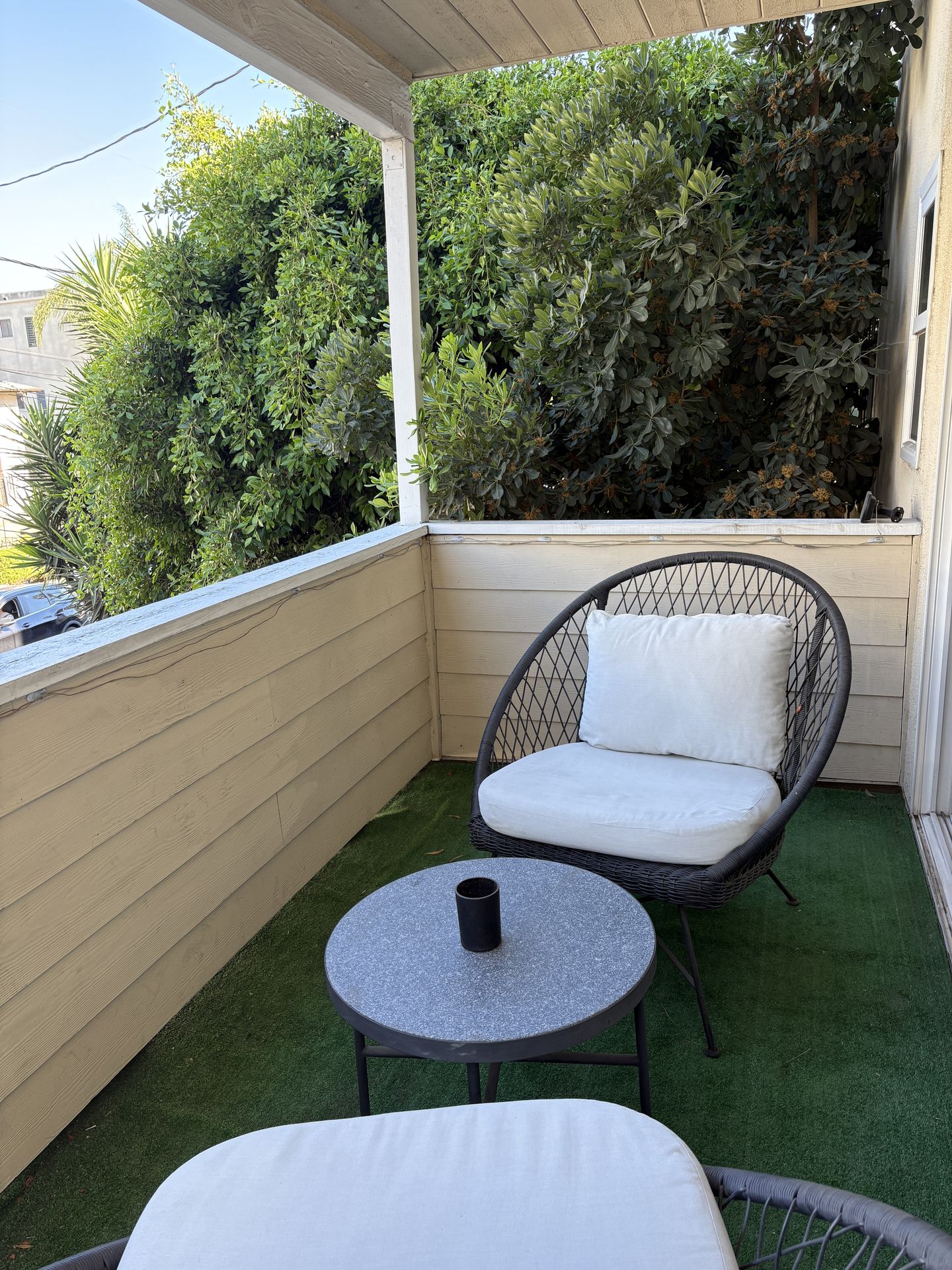 2 large chairs with stone top table
