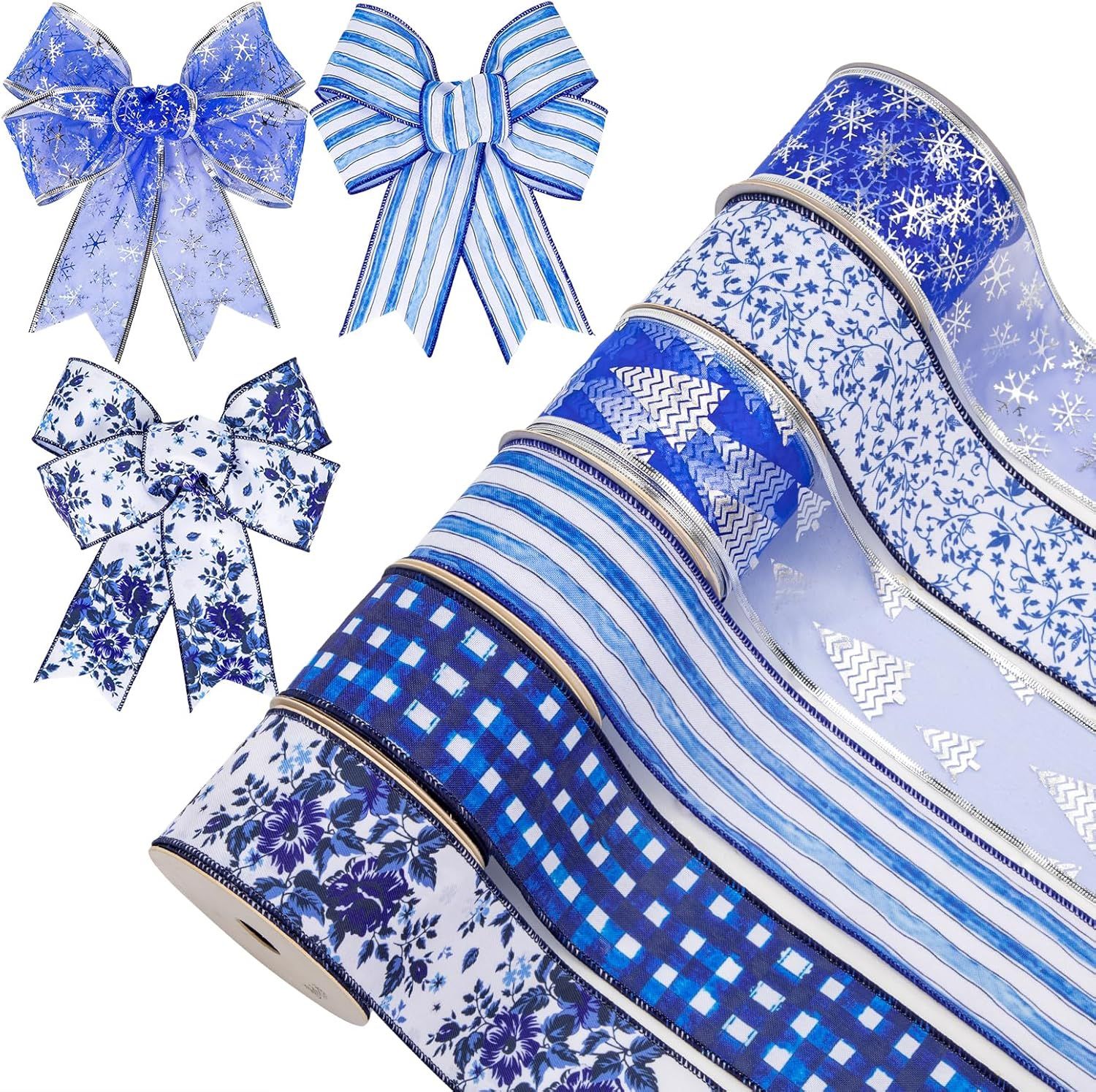 Blue and White Wired Christmas Winter Holiday Ribbons 2.5” Wide, 5 Yards (Set of 6) (NEW)