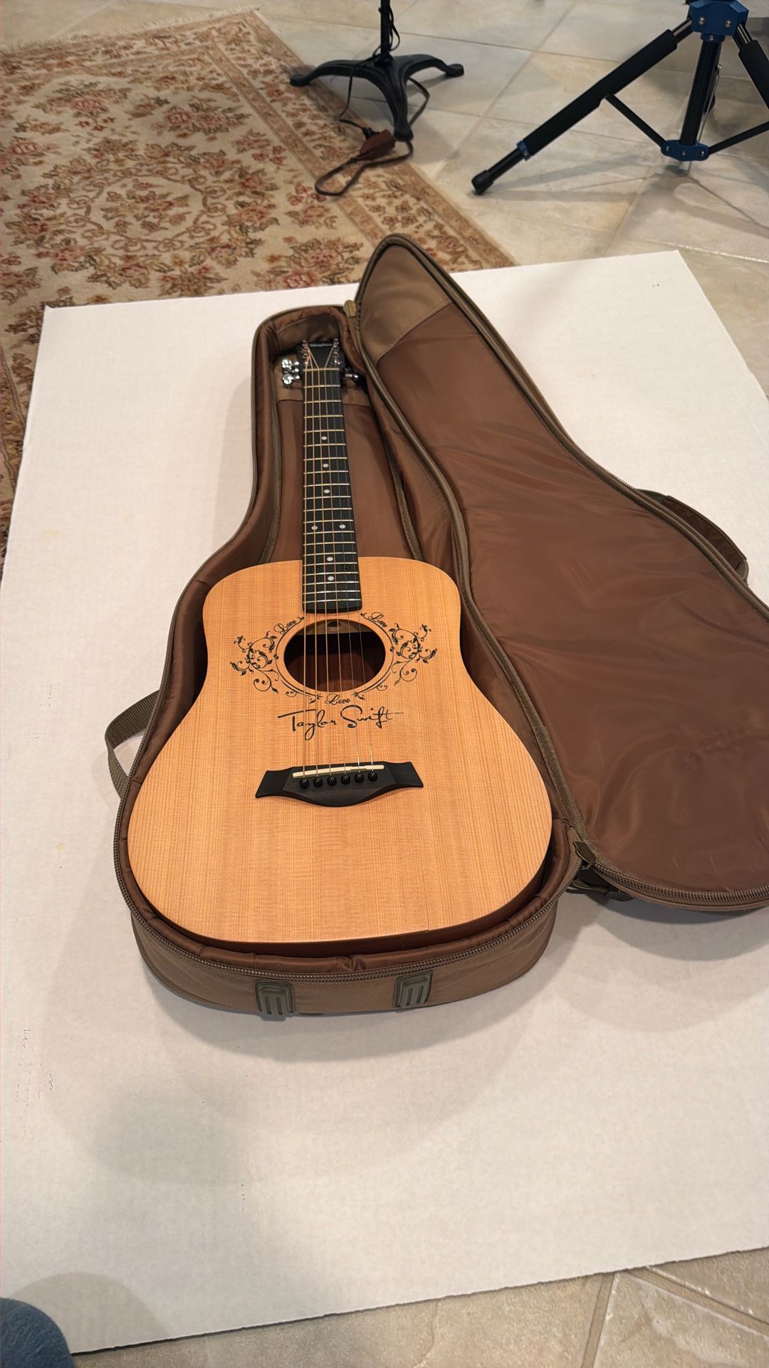 This is a baby Taylor Guitar in great condition, but it does have a small crack on the top. It does not take away from the playing and sound. I am the original owner and it comes with all of the original documents.