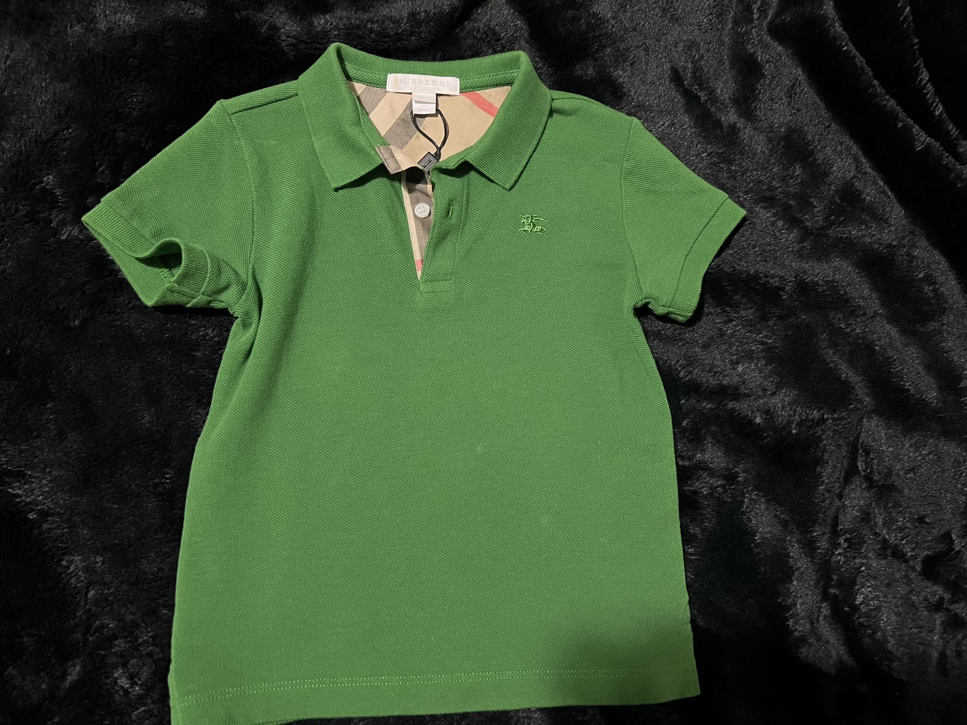 Boys Burberry Half Button Up Collar Shirt in new condition. Color: Green with Burberry plaid where the buttons are and behind the neck. Size: 4y.