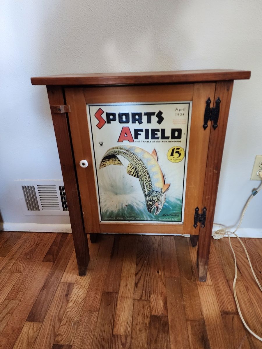 Fishing Style Wood Cabinet With Tin "Sports Afield" Graphic On Door