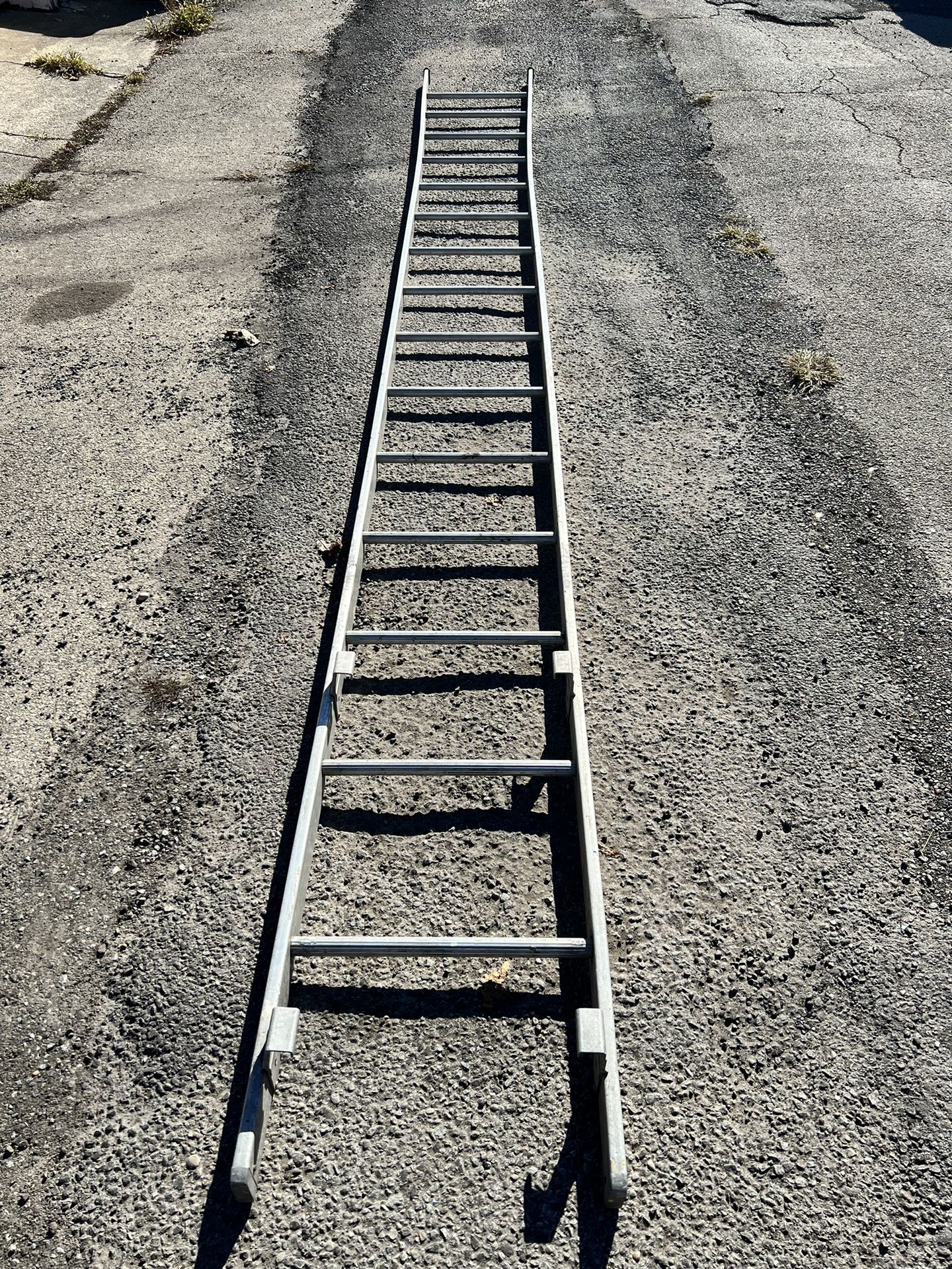 16ft Aluminum ladder ultra light and solid. Sturdy construction with extruded aluminum rungs and slightly flared bottom for increased stability. Great for cleaning leaf’s out of the gutters. Easy to handle because of its light weight. Great condition. Built when they built things to last.