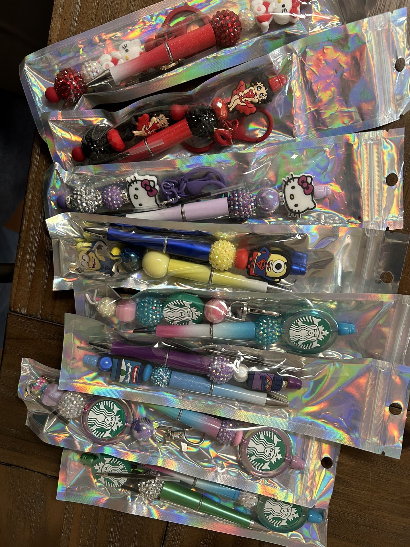 1 pen- $7 add ons are extra 2 pens- $12 3 pens- $ 18 Wristlet- $10- $18 Mickey mouse, hello kitty, Starbucks, Chanel, Louis vuitton, Mexican concha, minnie mouse, karol g, Disney, Disneyland, Pixar, true crime, Wednesday, goth, lilo and stich, nightmare before Christmas, jack skellington, kuromi, Tiffany Co., raider nation, cowboys, Pokémon Message me for orders or pricing if interested These are ready for pick up . Pens, customized pens, hello kitty pens, Journaling, calendar, scrapbook, focal pens, planner, Erin condren, school, work, office, Keychain, girly, purse