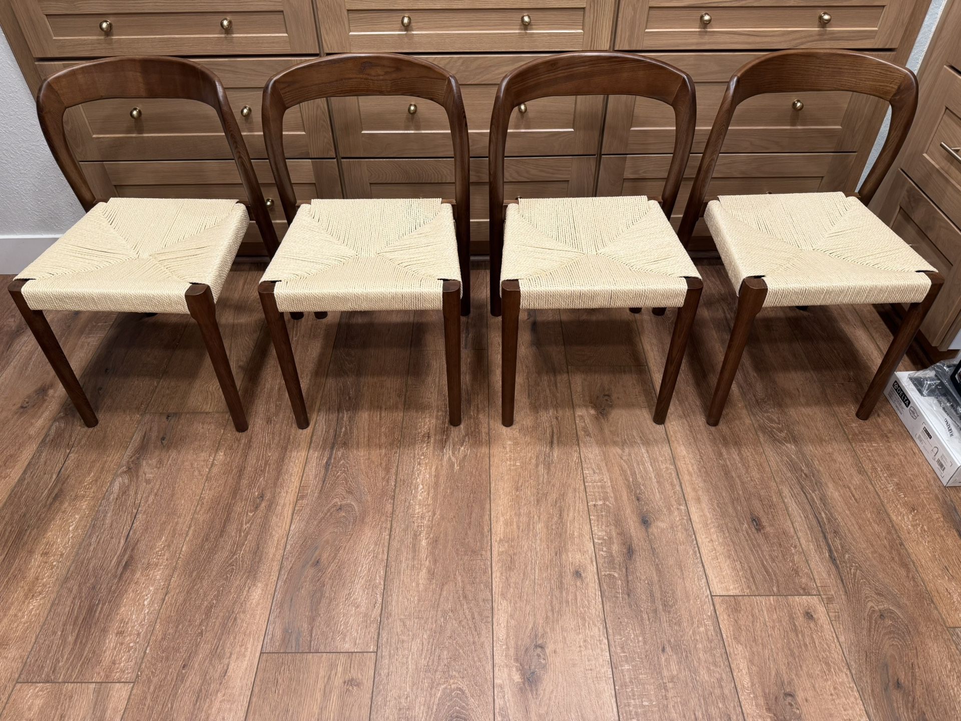 Retails for $650+. They are new out of the box and find that they just don’t match well with the table. My loss. Walnut wood and cream colored woven seats, very comfortable. Located in Temecula. Must take all 4.