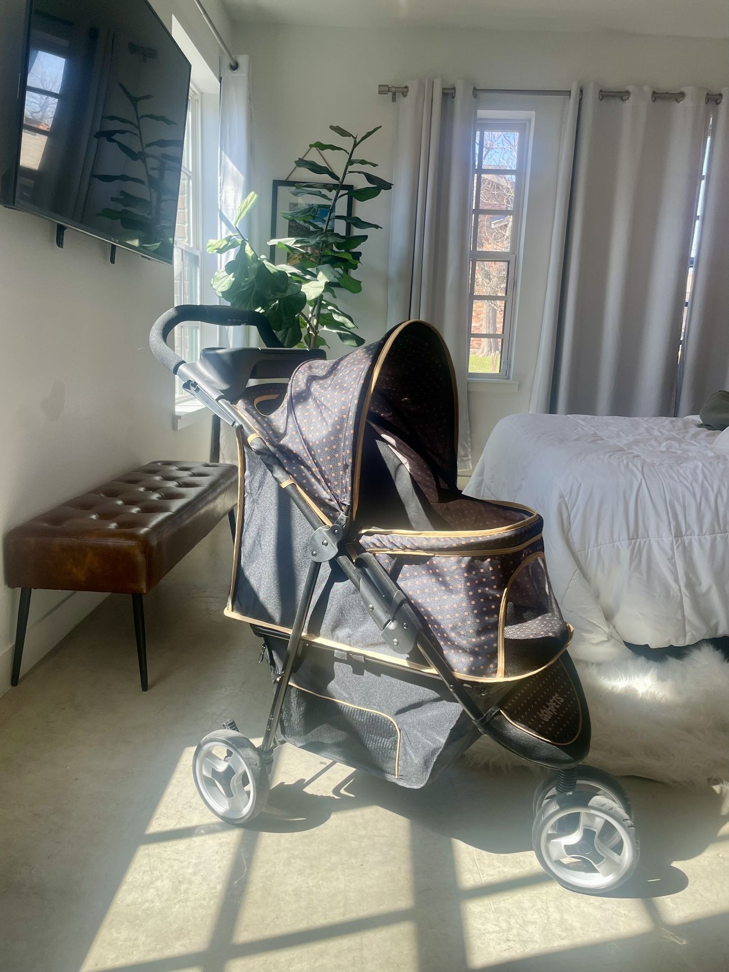If it’s listed, it’s still available. Will mark sold once no longer available. Retails $200. See screenshots for details. Barely used. We love it but we’re moving and can’t take it with us. Comfortably fit both of our 10-15 lbs shihtzus. Includes storage underneath, harnesses for safety, cup holders, phone holder, and good for jogging.