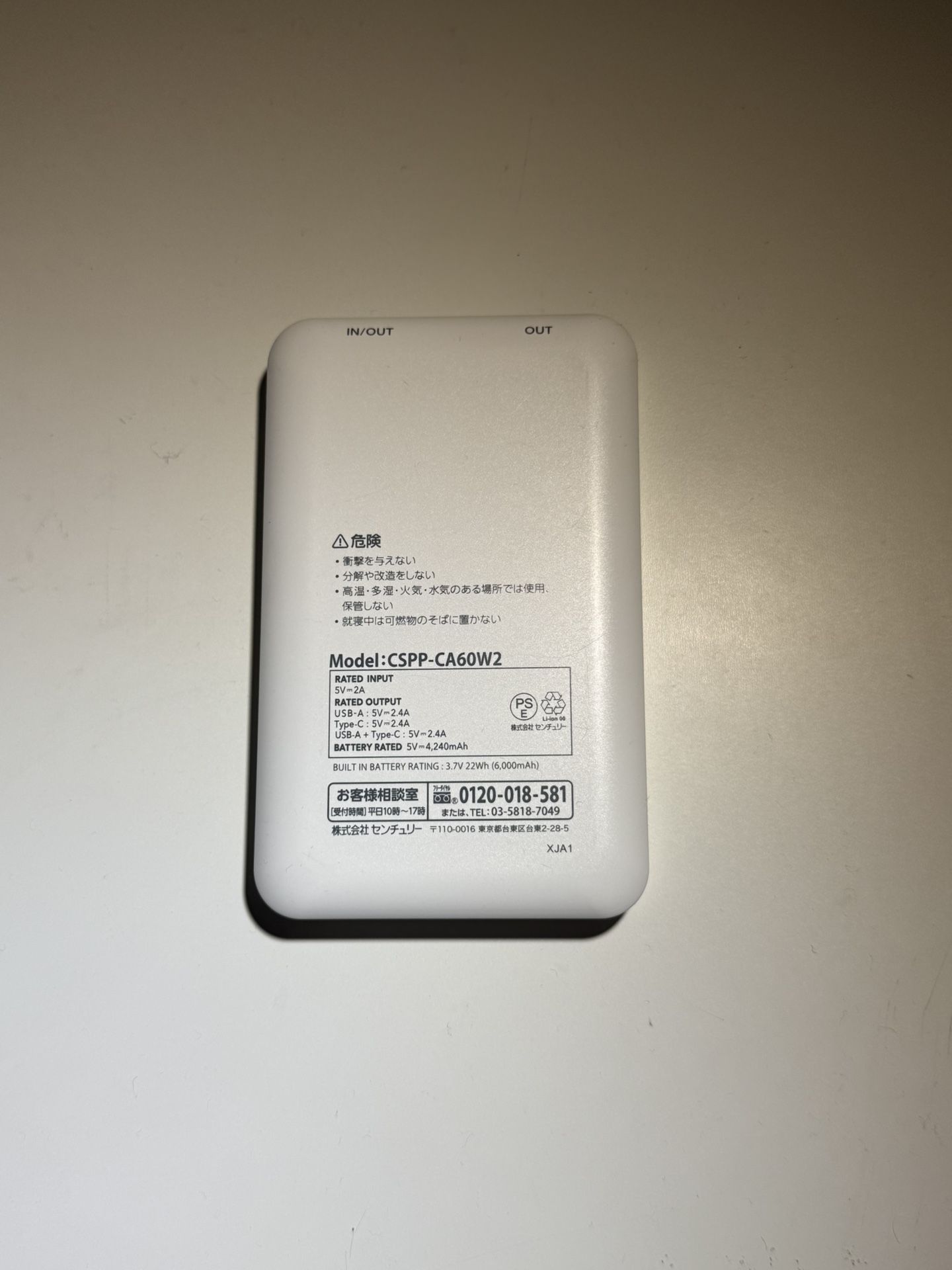 Model: CSPP-CA60W2, Rated Input: 5V-2A, USB-A Output: 5V-2.4A, USB-C Output: 5V-2.4A Bought in Japan. No longer needed. 6000mah capacity.