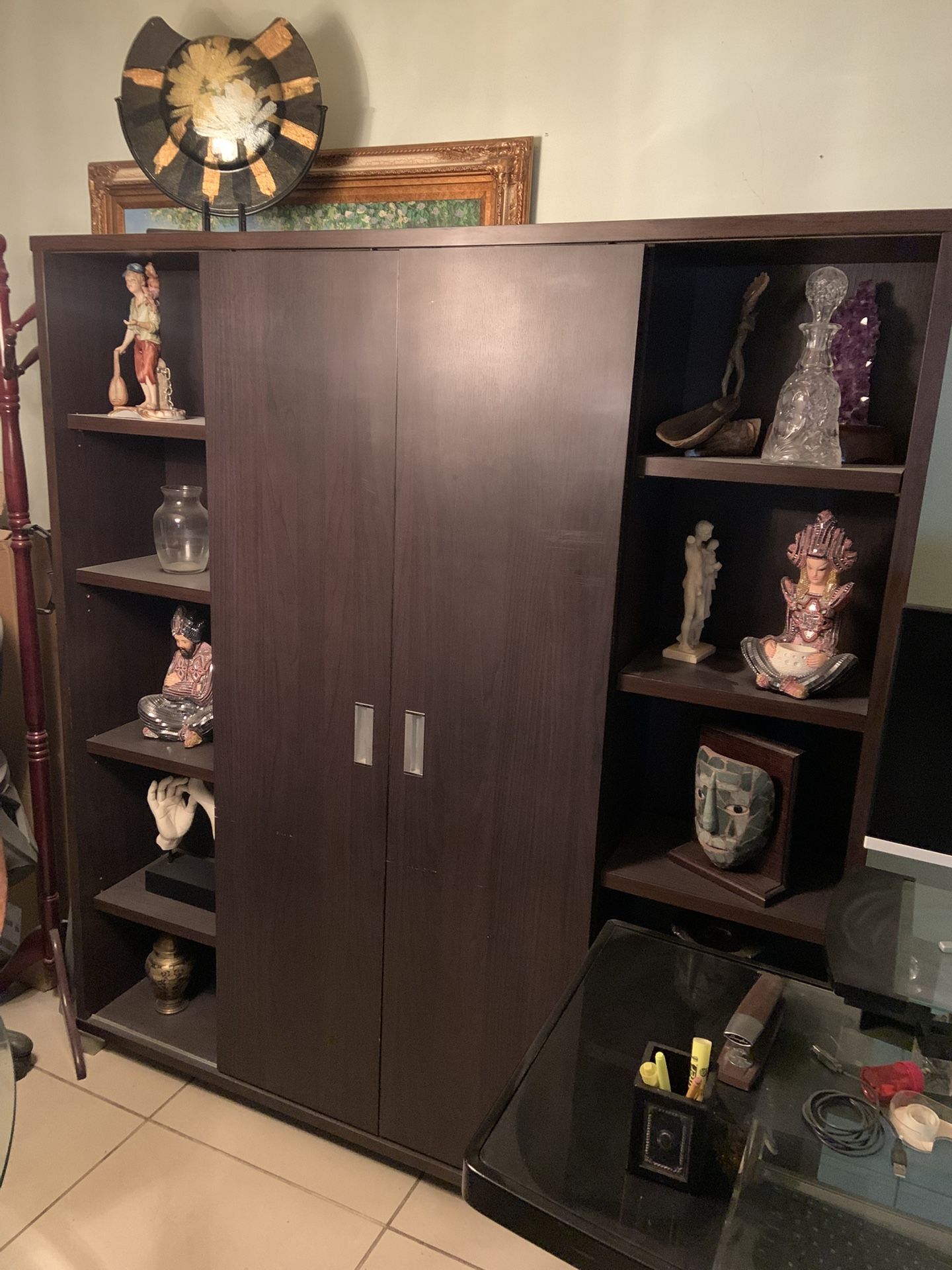This a high quality display case, Not Ikea Chinese particle wood quality. Its in great condition. Its got a rich dark brown color. Great for displaying books, or your precious stuff. Size 71 inches in height, 64 inches in width, 12 inches in depth. We also can sell you some of the neat ornaments for 5 bucks each.