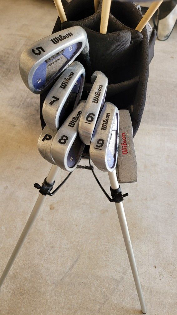 Wilson women beginner golf set. 1,3,5 driver, 5,,6,7,8,9 pitch and putter. All in excellent condition. 3 pairs of new gloves, and balls. Ready to play. Without bag cover