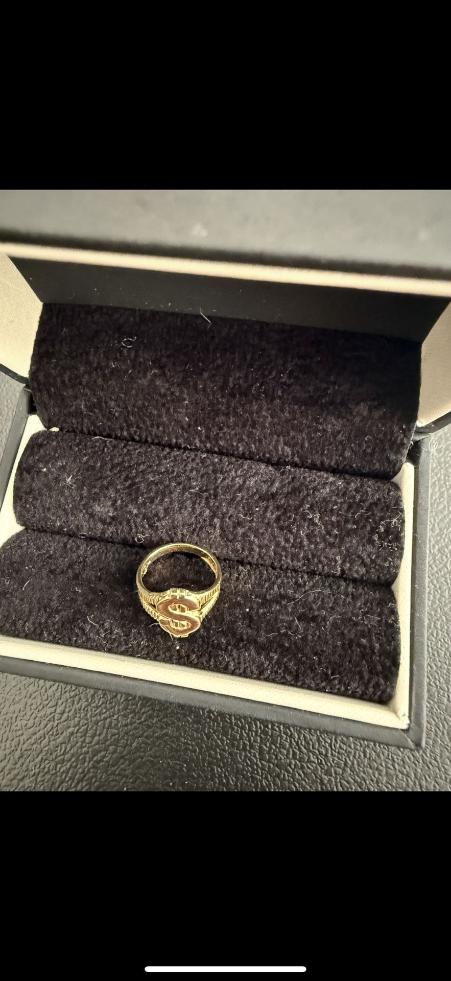 Dollar sign ring in 14k for toddlers its almost half the size of a dime forgot what size but it doesnt fit my child anymore no use for it at all, $150 or best offer dont be shy, can meet at pawn shop or your more than welcome to bring your own acid test, genuine 14k gold