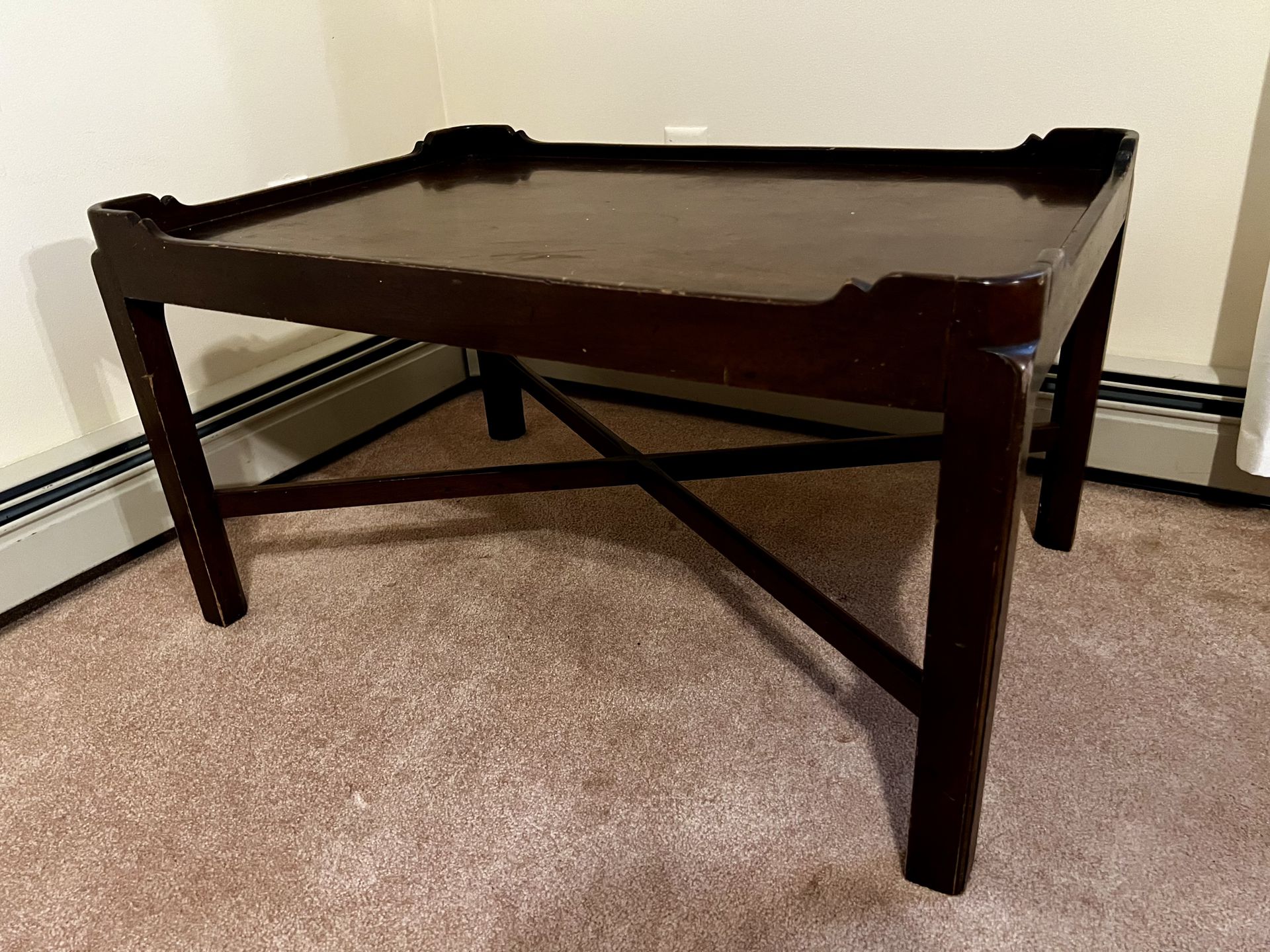 Good condition, could use refinishing or enjoy as it is! Very sturdy, solid wood table Made by Henredon, has a few makers marks on the bottom Measurements are 32” long, 22” wide, 17.5” tall