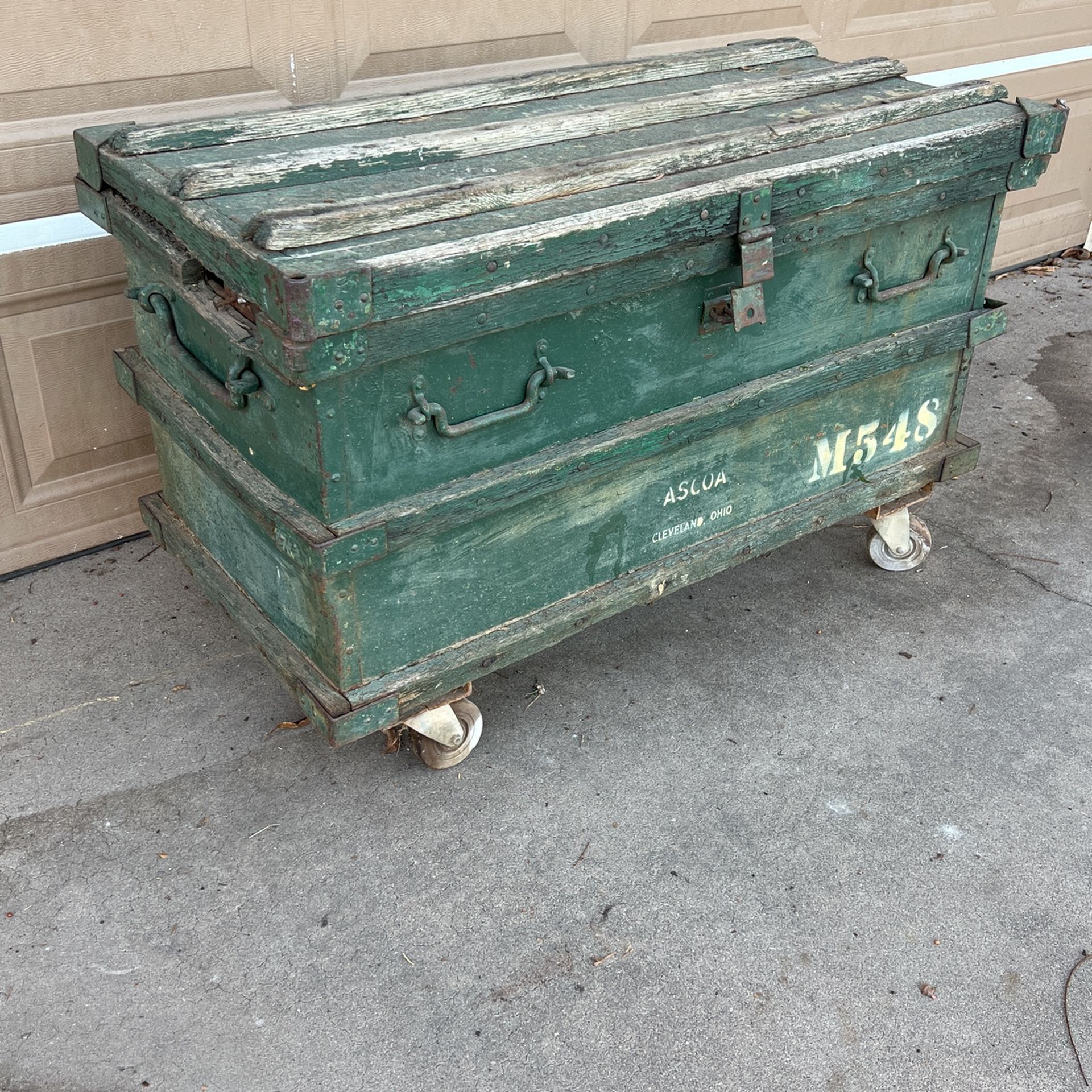 Antique Military Ammo Box Trunk Hope Chest, shabby chic perfect gift for your man garage cave Text me 480 54O 759three 45” wide 24” deep 28” tall with wheels as is 22” tall if you take wheels and forklift sleeves off and put base to the ground Hate to let it go … First come first served