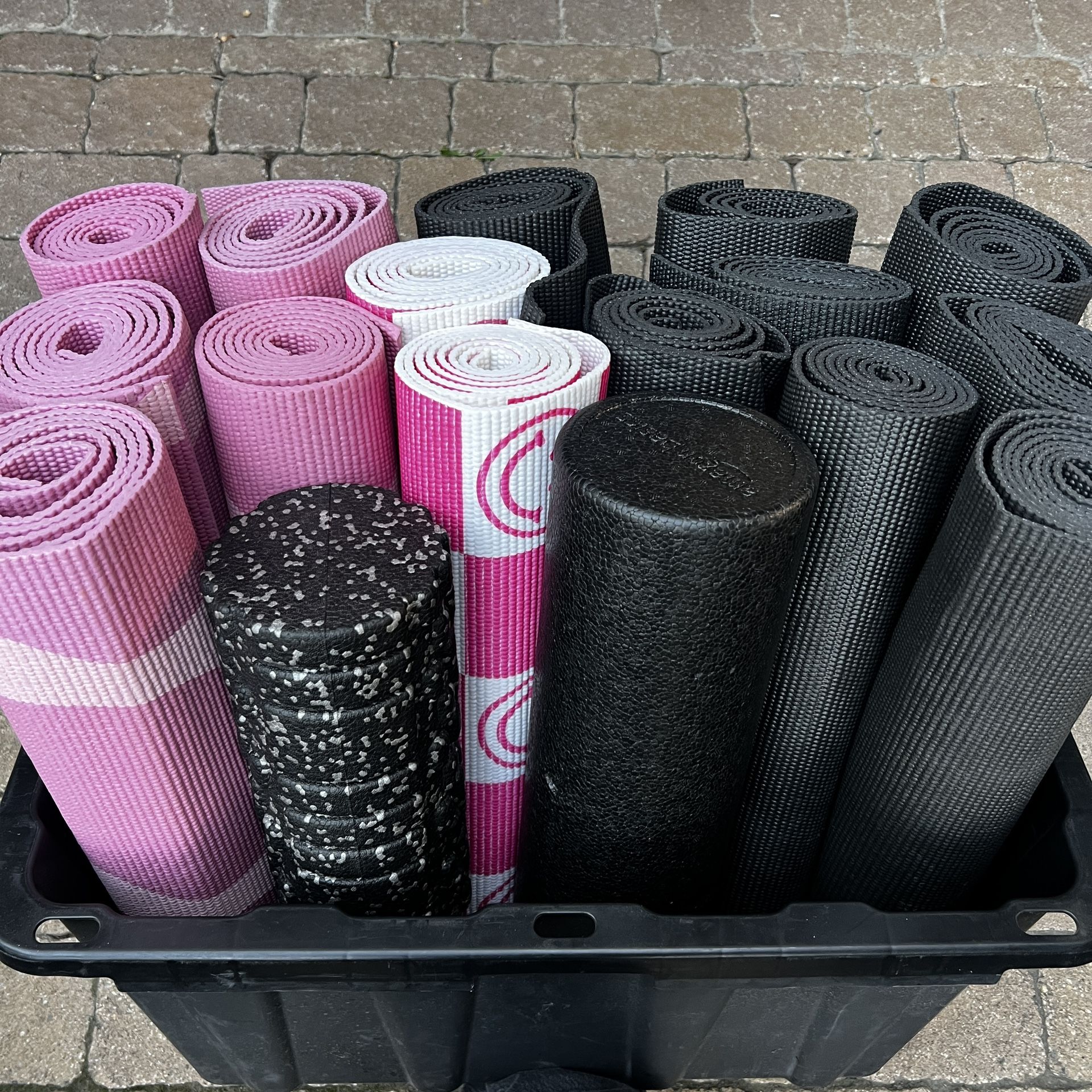 Used but good condition. 15 mats 2 small foam rollers Perfect for yoga teachers teaching classes. Comes with bin.
