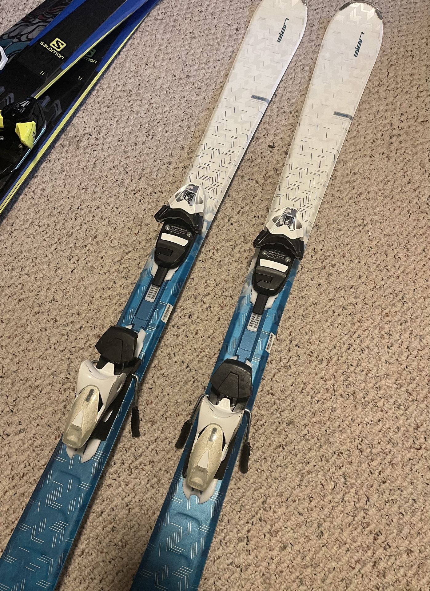 These were purchased new and have been fabulous skis. They are in great shape and are ready to go. Narrow waist means they are lightweight on the chairlift! Bindings are included and are set for size 7 women’s ski boots.