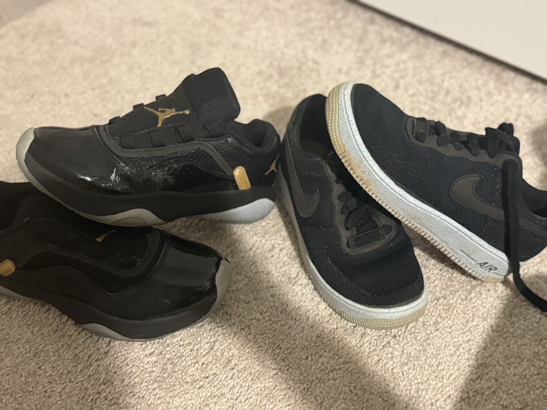 Boys Namebrand shoes Sz 3.5 in good preowned condition with normal wear & dirt. Jordans (will need shoestrings) and Nike Air Force 1’s sPlease be sure to follow me an check out my other listings as I post often.