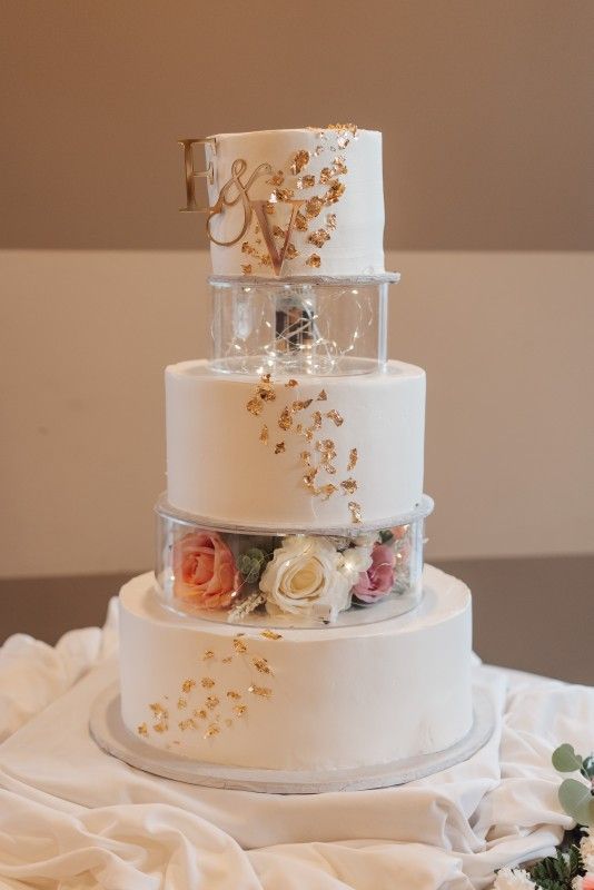 Two acrylics cake stands. One 12 inch diameter and the other eight inch diameter. One string light and flowers included. Small scratch on the 12 inch.