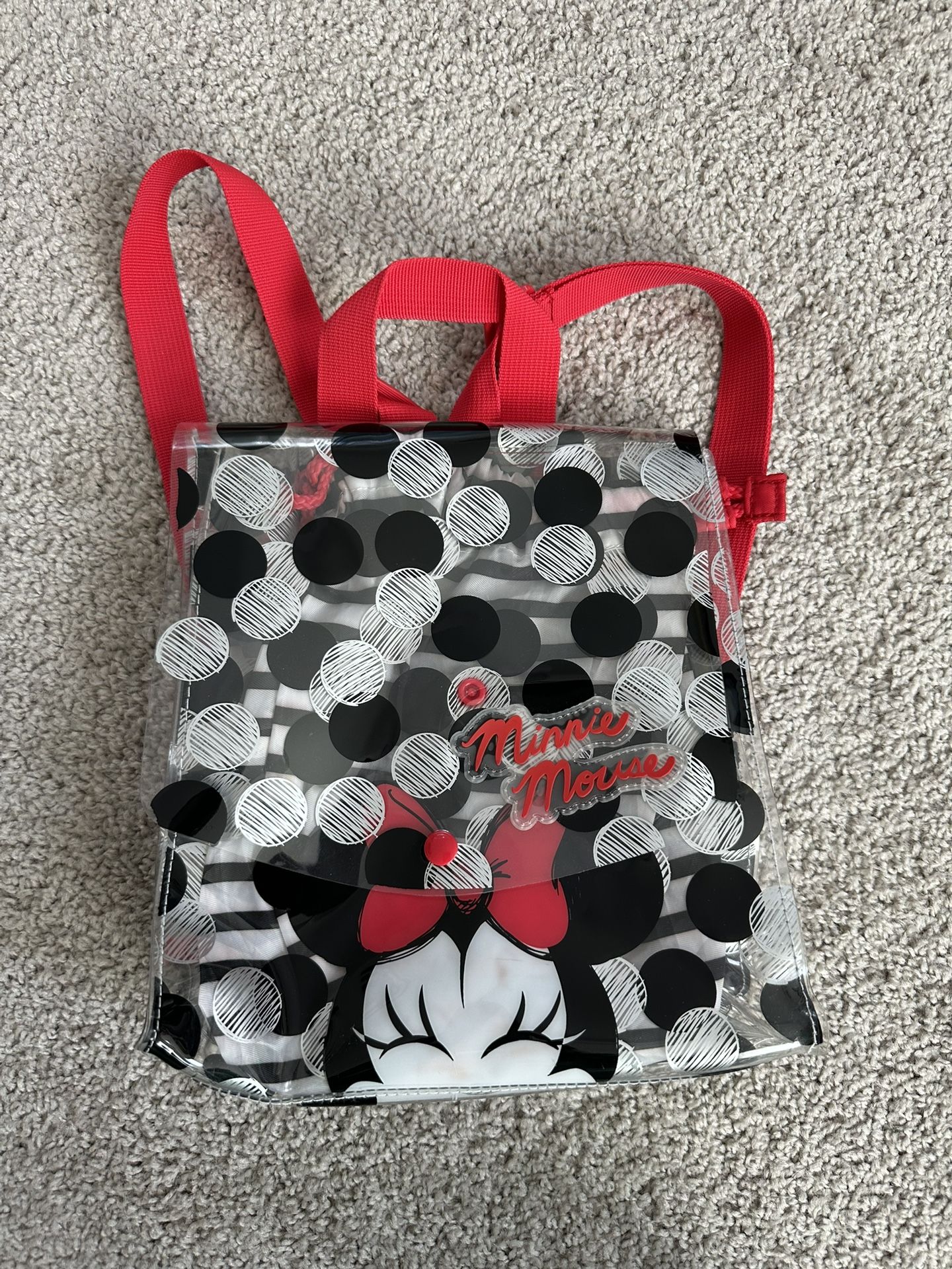 Stylish Minnie Mouse clear backpack featuring a playful black and red design. Perfect for adding a touch of fun to kid’s outfit. Still in good condition Rarely used Size: L - 10”, W - 9” Adjustable straps Colors are vibrant Great bag to use in amusement park, daycares, school or short outings Good for storing snacks, crayons, small books, even small water for amusement parks Flaws : crayon stains on inside bag (see pics) so price reflects Comes from smoke free and pet free home