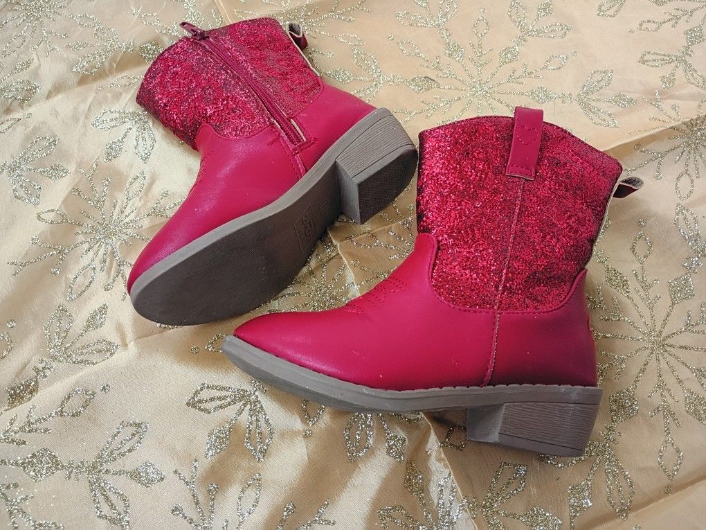Sparkly Western Cowboy Style, Excellent Condition! Super cute and eye-catching red glitter cowboy boots for toddler girls, size 11. Sparkling glitter on the upper shaft, smooth red faux leather on the foot with western stitching, easy side zippers and comfy low heels. Perfect for dress-up, parties, holidays, or everyday. Gently used, excellent condition and lots of life left. Smoke-free home. Must pick up near Walmart