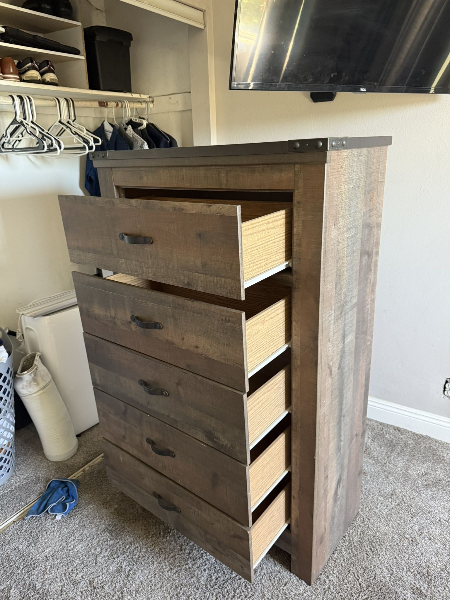 Good condition, cabinets roll out normally just small scratches and paints scuffs hardy noticeable. Perfect for kids room or master room. Lots of space, it’s a bit heavy and large so you’ll most likely need a bigger vehicle. I would be up to delivering depending on location