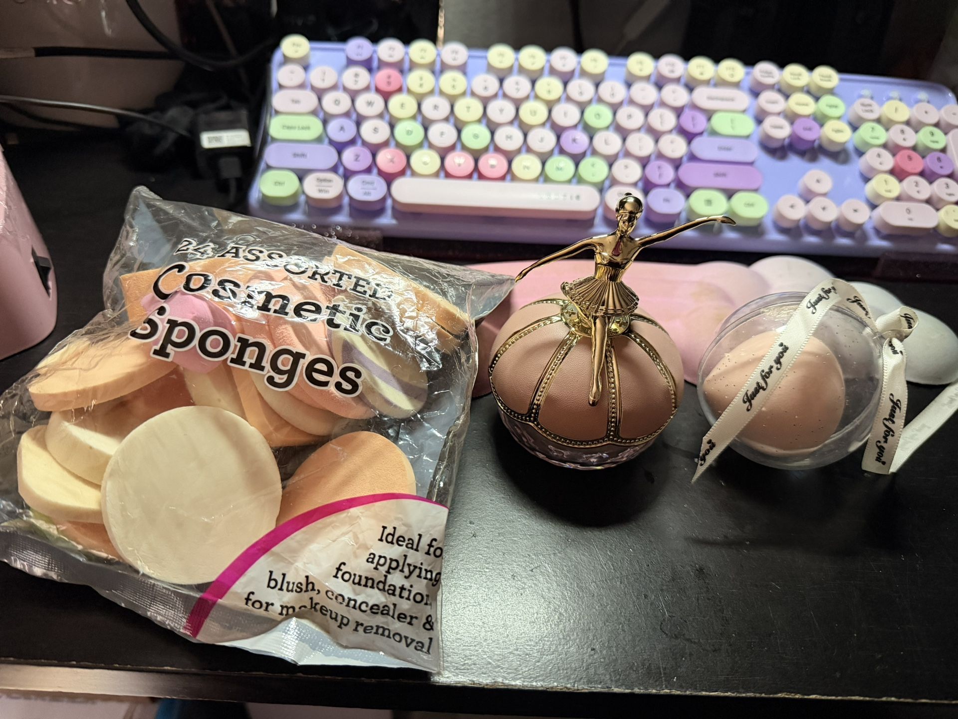 Ballerina finishing powder, a beauty blender, and a pack of sponges all new