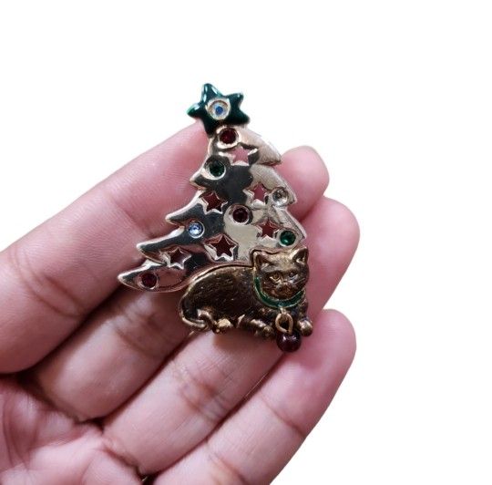 1.75" This vintage brooch is perfect for adding some holiday sparkle to your outfit. The gold toned Christmas tree is adorned with multicolored gemstones, and a cute cat is resting at the base. The piece is made of yellow gold plated metal and has a vintage feel. It would make a great addition to any jewelry collection, whether you are a fan of vintage and antique pieces or just appreciate a unique accessory. The brooch is perfect for wearing to Christmas parties or for adding some festive cheer to your everyday look.