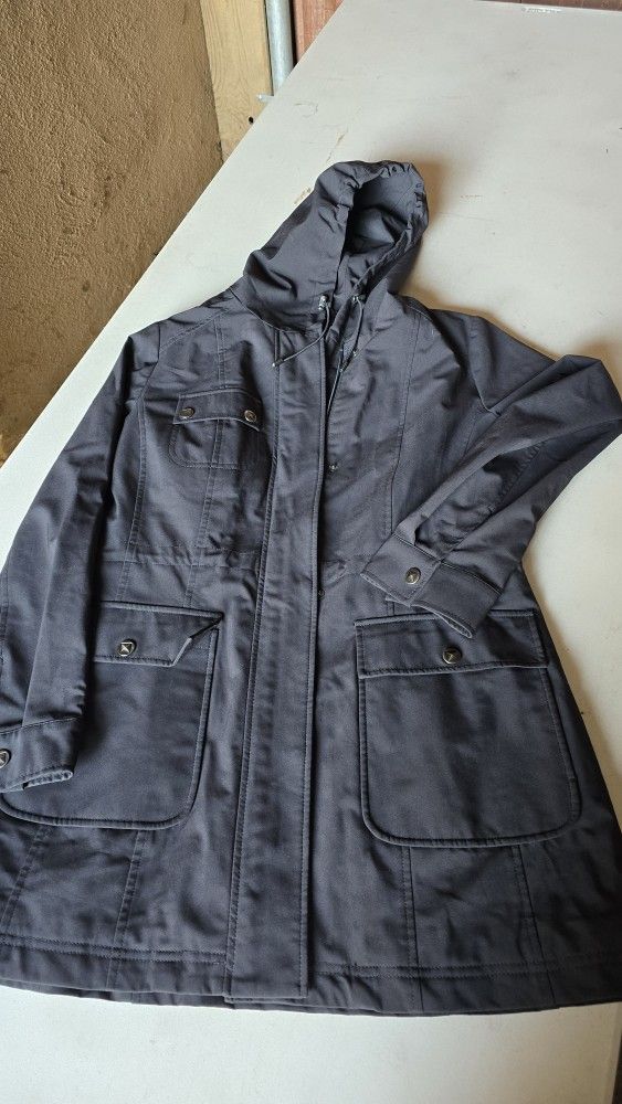 Ladies Kristen Blake black hooded jacket, pockets, zips and snaps up, size Small. Cash n Pick Up.