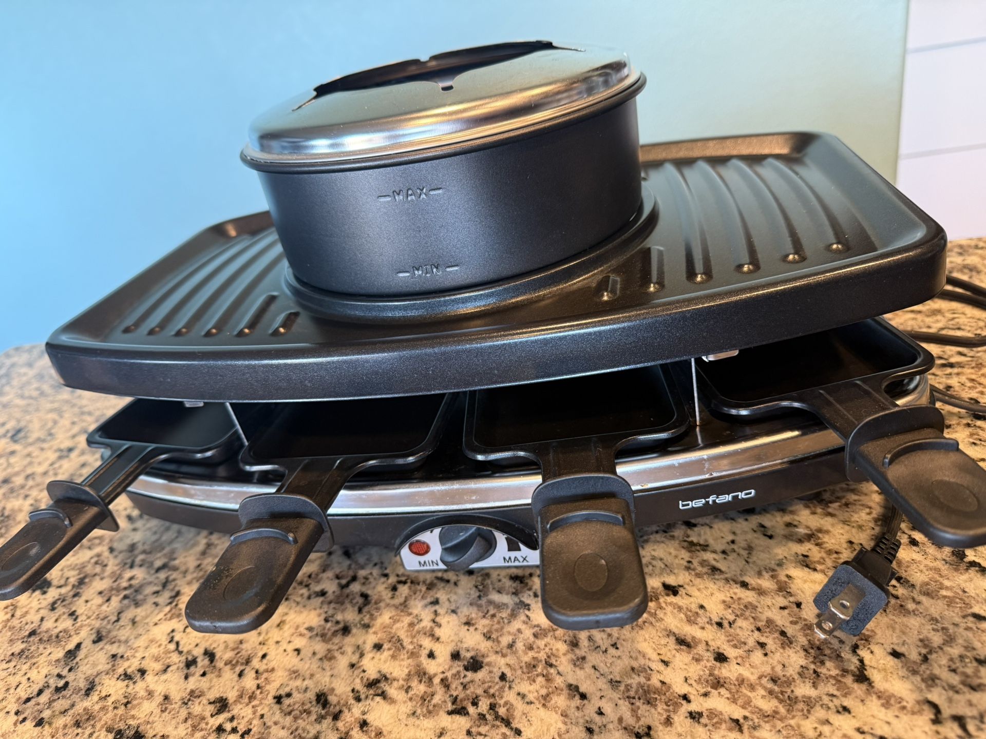 Befano electric raclette grill & fondue set. Used only a few times. Everything works perfectly. Includes accessories shown in 3rd photo. Selling because we didn’t end up using it much. $40 firm. Cash only.