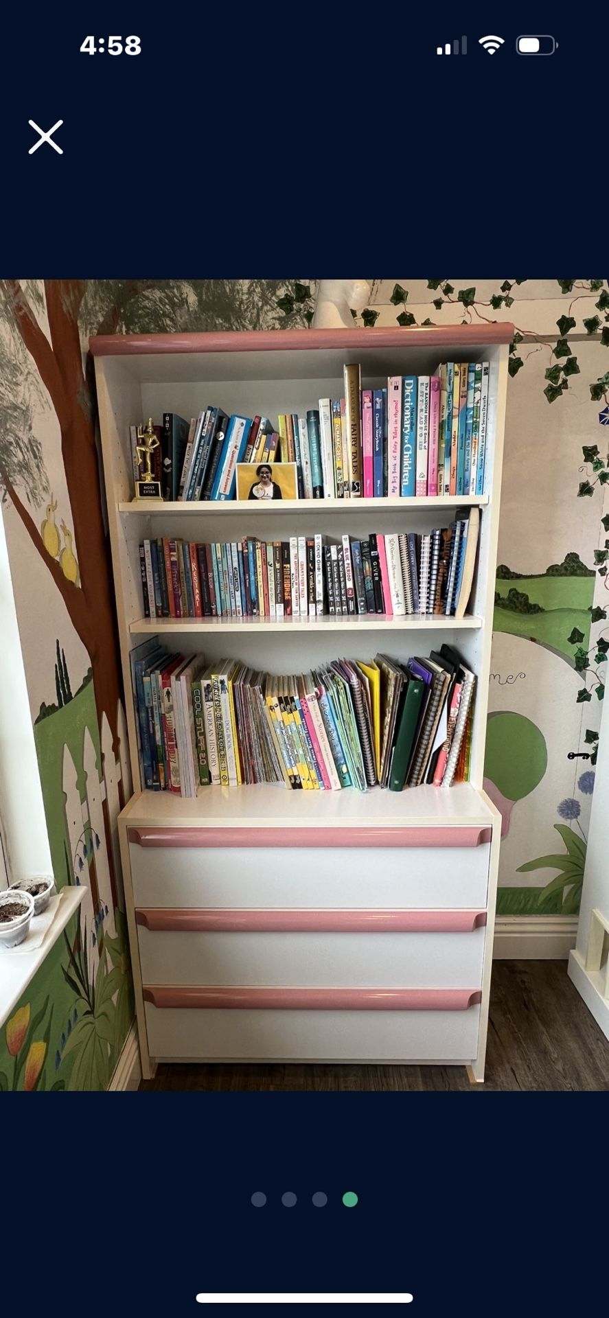 High quality, heavy bookcase, perfect for girls. No stain or damage. Drawers work great. If you see the add it means it is still available. Some of the books are available for sale too. Kids room, bookcase, desk, drawers, girls room,Shelves