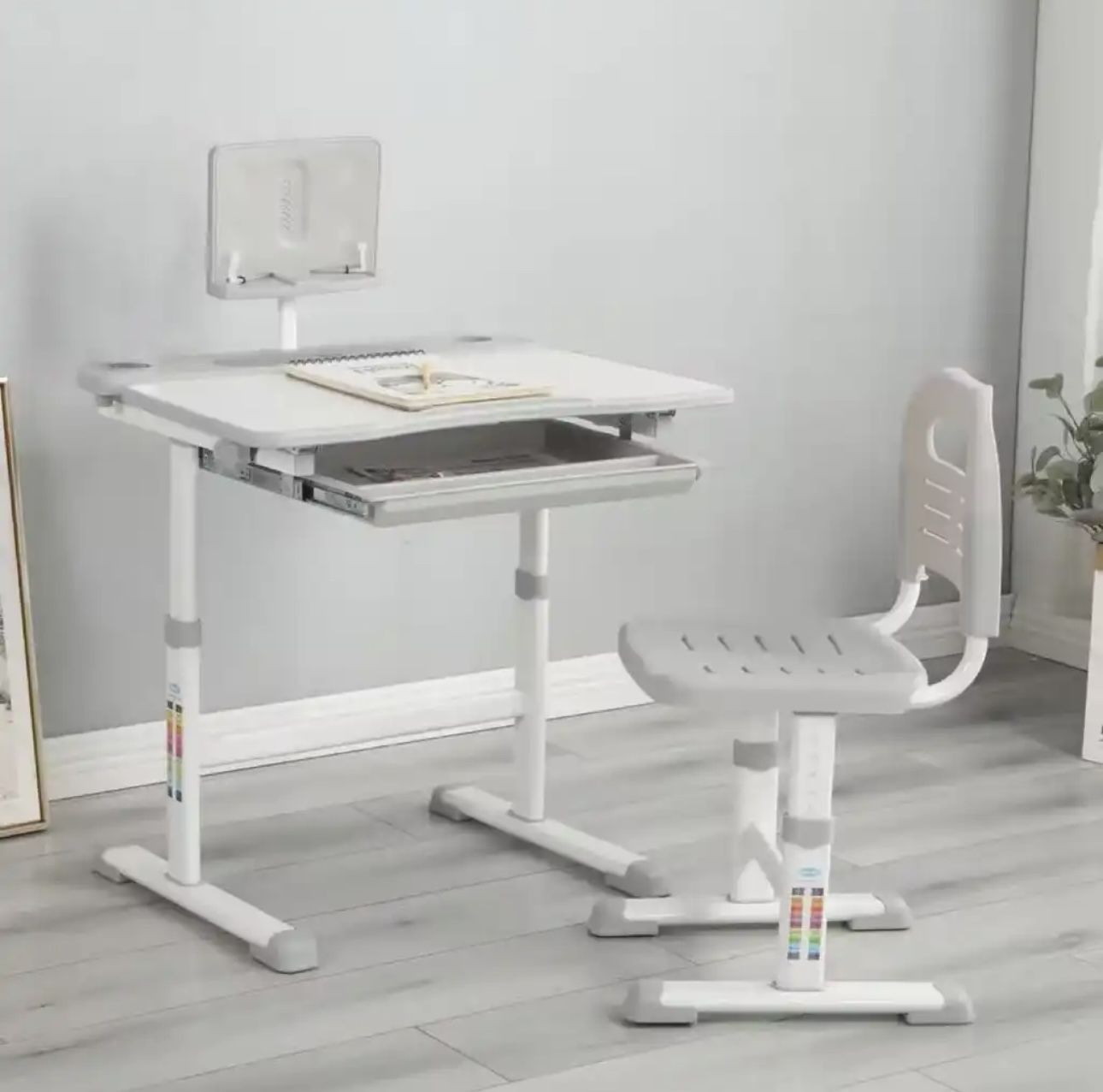 White adjustable desk and chair set for kids with storage drawer. ✅ Adjustable height – Desk & chair grow with your child (approx. 9 inches) ✅ Tilted desktop – Up to 60° for better posture and focus ✅ Smart storage – Pull-out drawer + pencil & cup holders ✅ Extra reading board – Holds books of all sizes, saves space ✅ Sturdy & safe design – Solid steel frame, smooth finish, rubber safety stops 💡 Perfect for kids’ study, art, or playtime. White, clean, modern design – makes any room brighter! 📍 Local pick-up only – grab it before it’s gone!