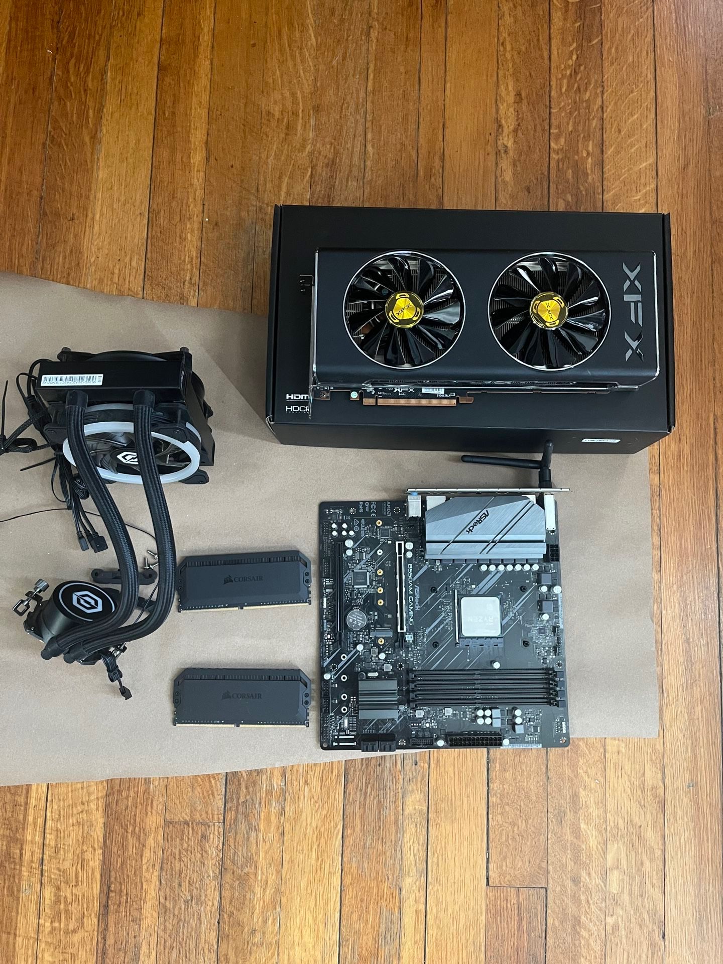 Computer Parts you will receive exactly what’s pictured PLEASE ONLY PURCHASE IF YOU KNOW WHAT YOU ARE DOING EVERYTHING IS IN WORKING CONDITION ONLY SELLING BECAUSE I UPGRADED AMD Ryzen 7 3700x Processor Asrock B550AM Gaming Motherboard Cooler Master Master Liquid Lite 120 Corsair Dominator 16GB RAM 3600MHZ XFX 5700XT Thicc ii Ultra Boost Up 8GB Graphics Card