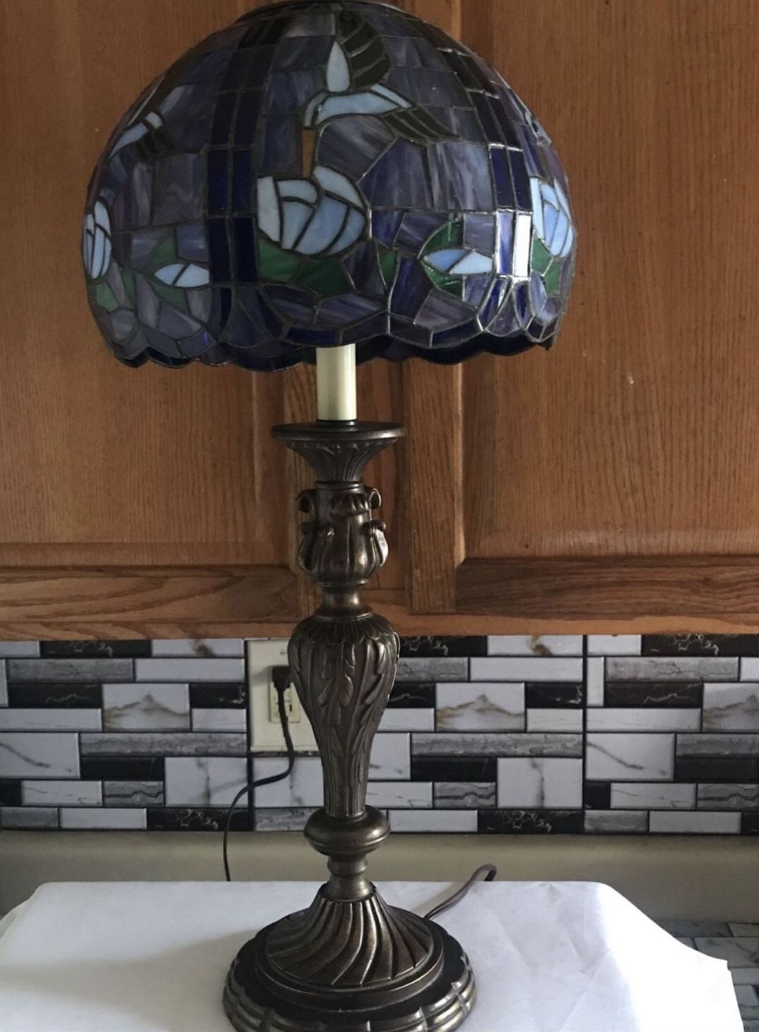 Stained Glass Shade: The shade is composed of intricate pieces of colored glass, creating a mosaic design. Floral Motif: The lamp features a floral pattern, a common theme in Tiffany designs. Bronze Base: The base is likely made of bronze or a similar metal, a hallmark of Tiffany lamps. We have to much nice stuff, we will let this lamp go for $60 , please let me kno if your interested, thank you