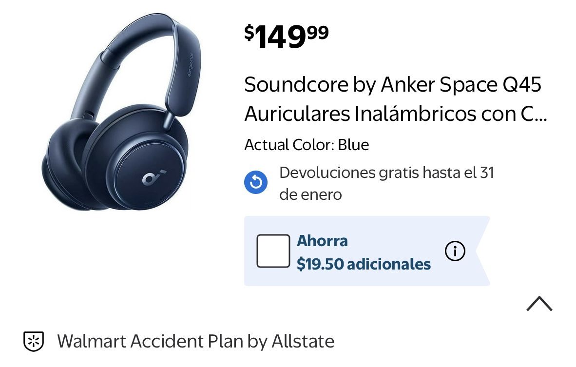 Soundcore Q45 blue Brand new I opened them but never used them; I have others. They are comfortable and lightweight. soundcore by Anker Space Q45 Adaptive Active Noise Cancelling Headphones, reduce noise by up to 98%, 50-hour playtime, app control, wireless audio. Soundcore Q45 azul Son nuevo Los habrí pero nunca los usé, tengo otros. Son cómodos y ligeros soundcore by Anker Space Q45 Auriculares adaptativos con cancelación de ruido activa, reducen el ruido hasta en un 98%, tiempo de reproducción de 50 horas, control de aplicaciones, audio inalámbrico.