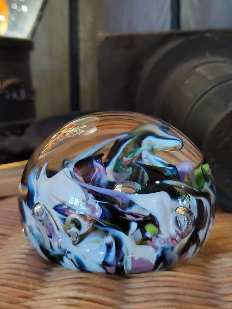 A captivating swirl of vibrant colors within this polished glass orb, creating a mesmerizing effect that brightens any space. Perfect as a gift or add to your collection