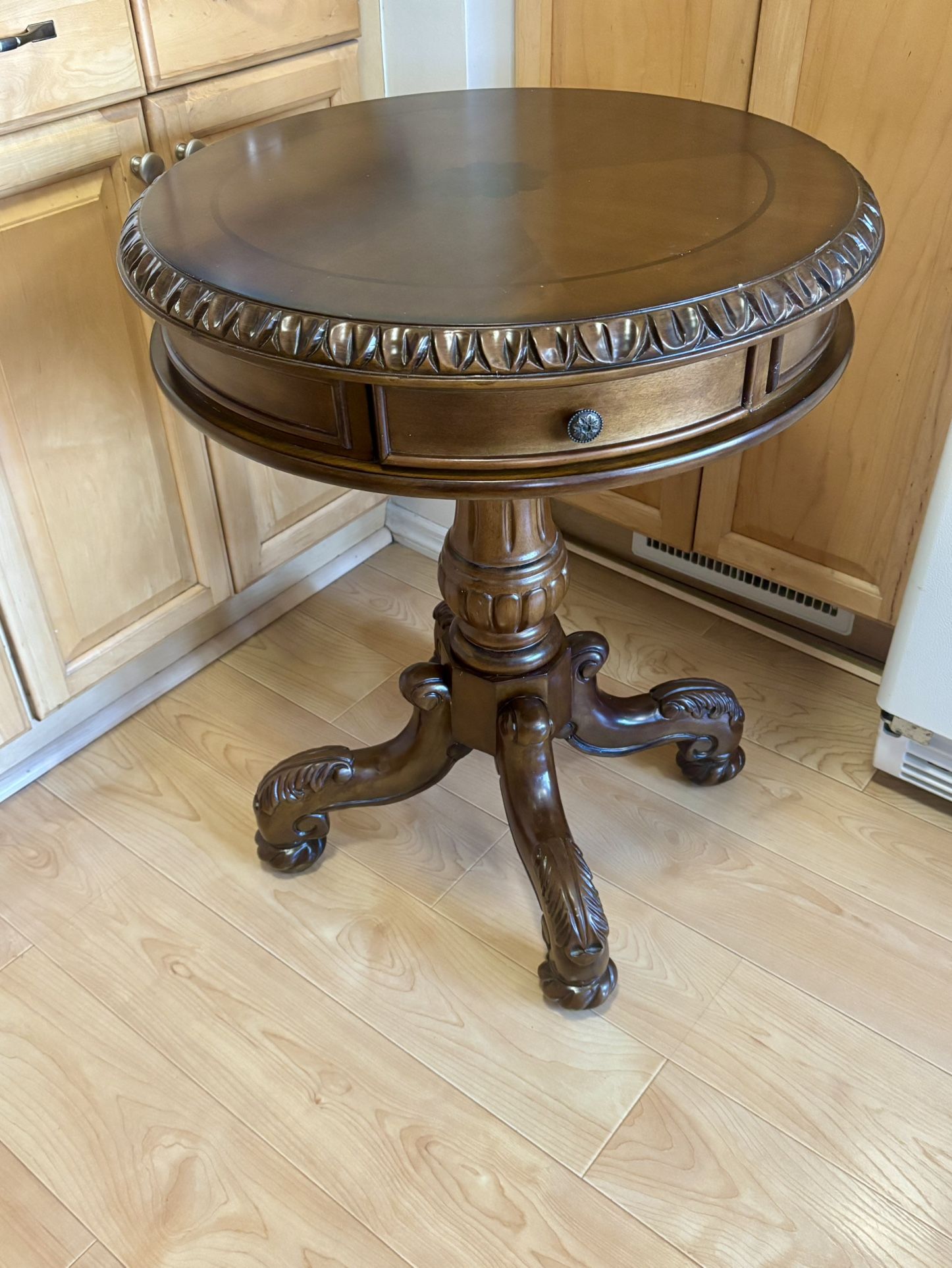 Touch of class, Cortona pedestal end table, autumn cherry – Victorian style furniture – round top with curved legs – antique side, accent, wood, end table for bedroom, living room, entryway, etc. . Retails for $569. This has a few scratches but overall in very good condition. Measures 23” round and 29” high.