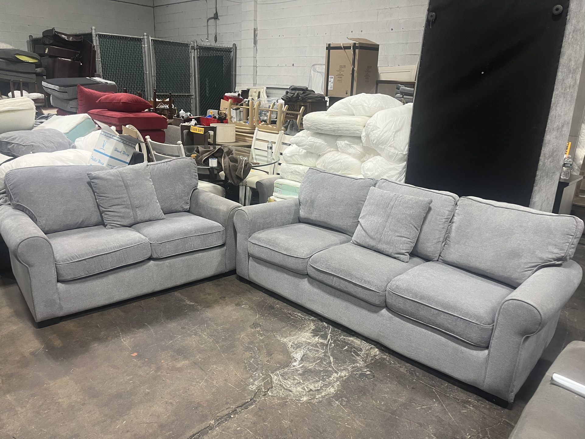 Macys Brand Sofa and Loveseat $550. Gray fabric sofa and loveseat with removable cushions, accent pillows, rounded arms and wooden feet. I have more items available. Check out my listings. Viewing by appointment only. Delivery available for a fee