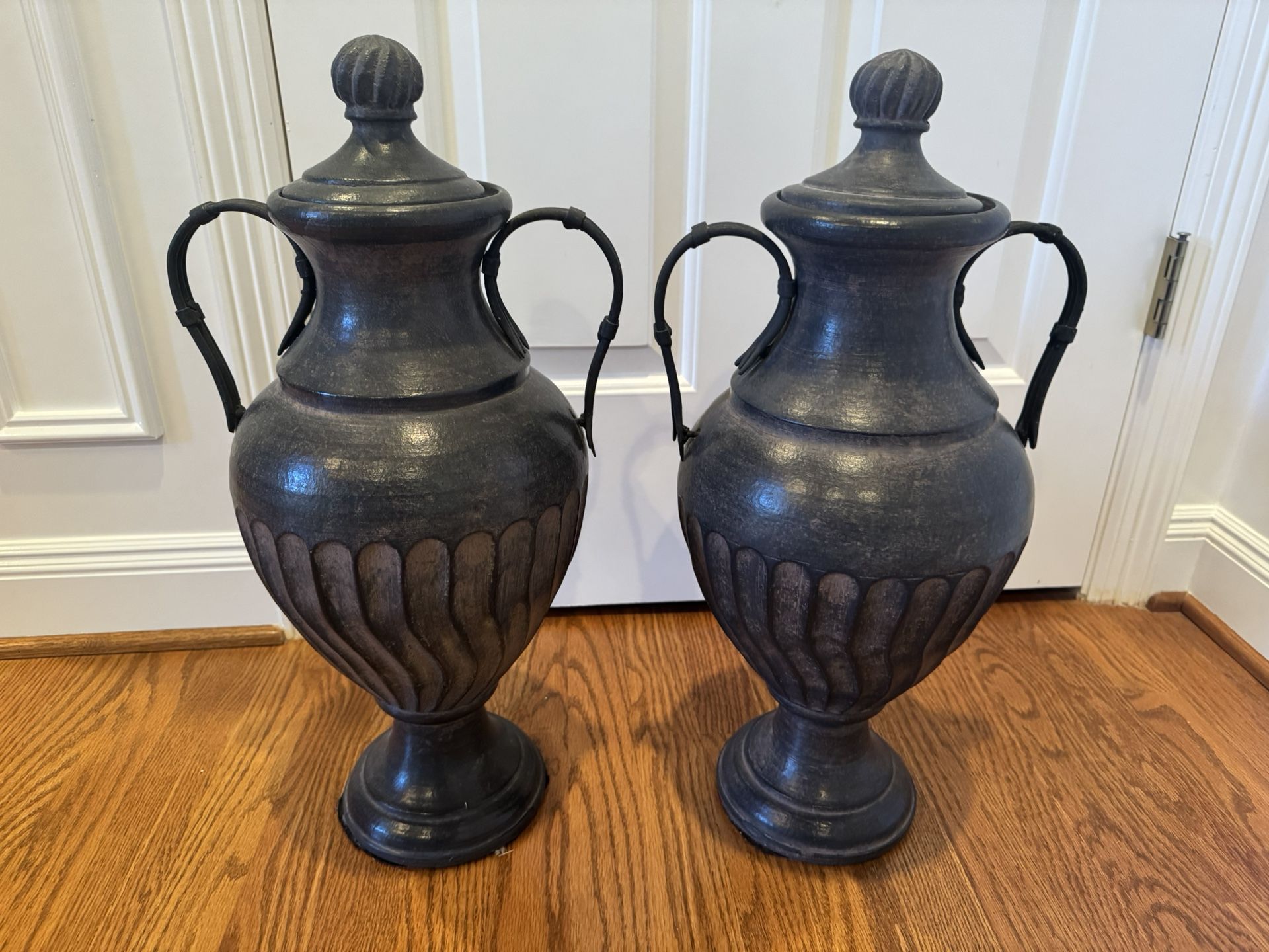 Set of 2 decorative urns. Heavy resin material, 22” H, dark brown/black color. No chips or scratches.