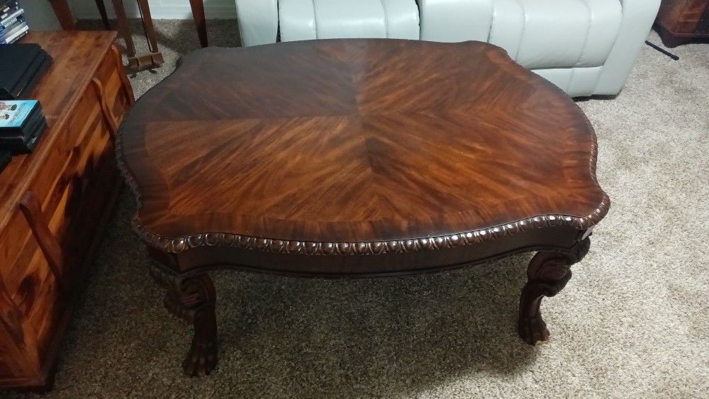 Large coffee table with ornate accents around edge and legs.