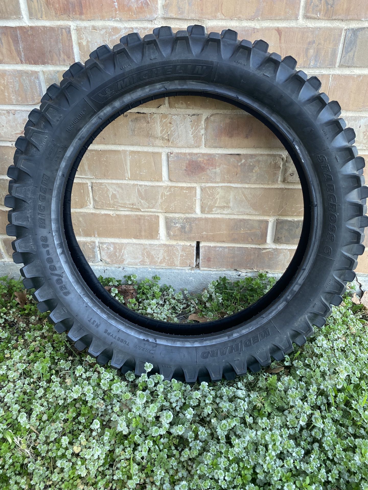 Michelin med/hard front and rear barley used with mousee bib tubes.