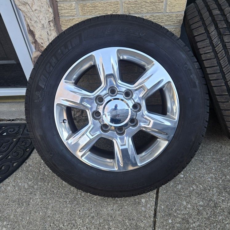 Polished rims with Michelin Defender lt265-60-r20 tires has brand new tire sensors and tires are about 70% to the good 8x180 bolt pattern